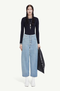 5-pocket cropped jeans cut from blue denim. The mid-rise design has a straight, yet oversized fit with a four-button closure and a wide waistband. A signature Margiela 6 jacron completes the design while MM6’s discreet yet distinct signature, a horizontal white stitch line, is present on the back of the jeans. Product Details Item ID S52LA0212S30589975 Composition: 100% cotton Pocket lining: 65% polyester, 35% cotton High-waisted 5-pocket denim trousers Straight leg Button closure Embossed MM6 numeric signature on back pocket White stitch line at the back Loose fit Made in Italy Model is 5'11" tall and wears a size 26.