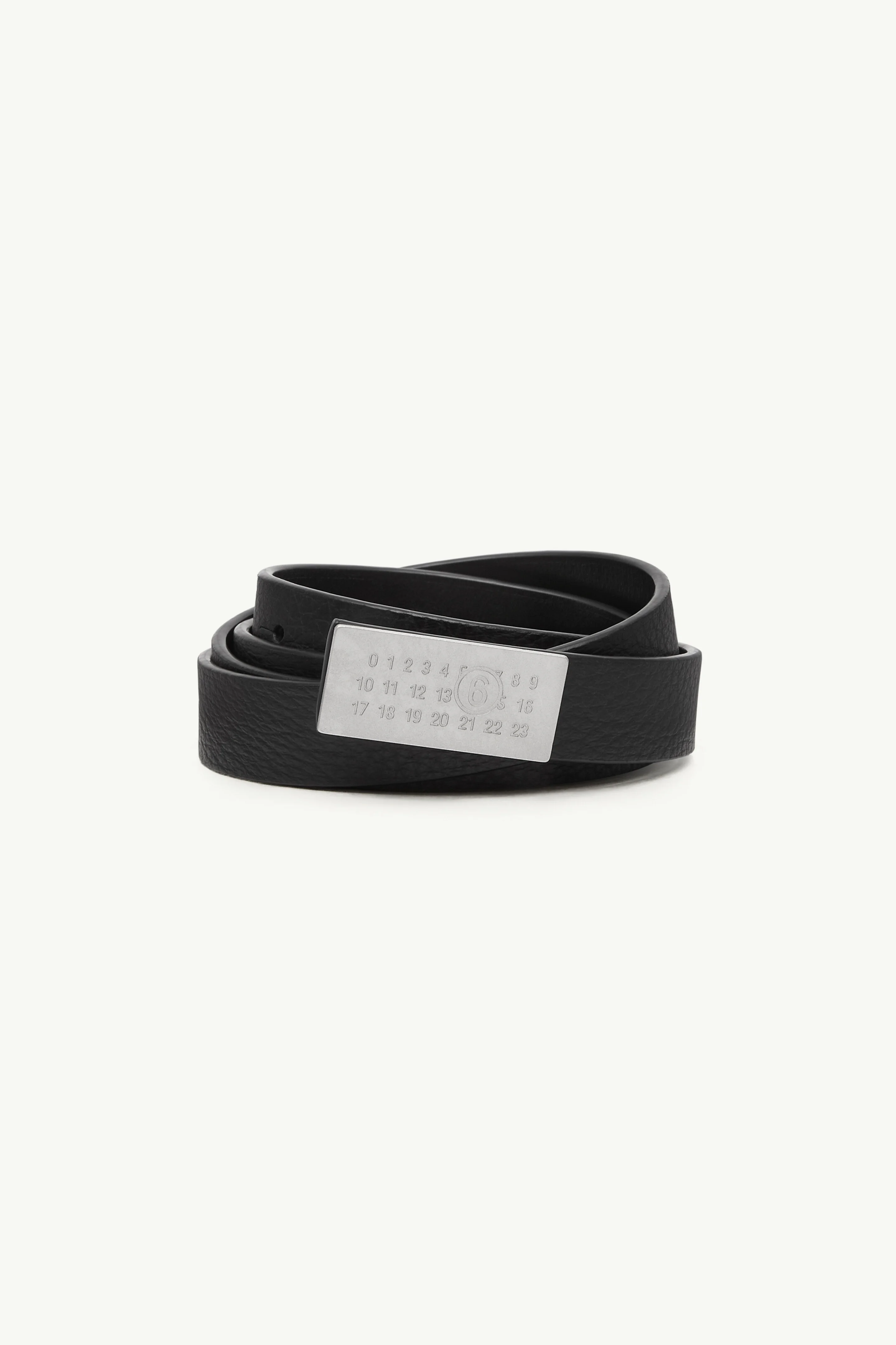 Subtle yet distinctive, this grainy leather belt refines everyday accessorising with MM6’s signature design. A slim profile and minimalist construction ensure versatility, while the numeric artwork on the buckle introduces a quiet statement of identity. Product Details Item ID SA5TP0011P8326T8013 Body: 100% calf leather Inside: 100% calf leather Metallic parts: 100% zama Belt in grainy leather Adjustable length Numeric signature engraved at the front White stitch line at the back Made in Italy