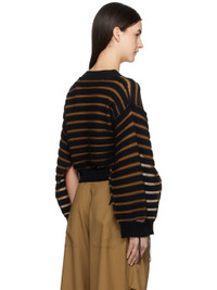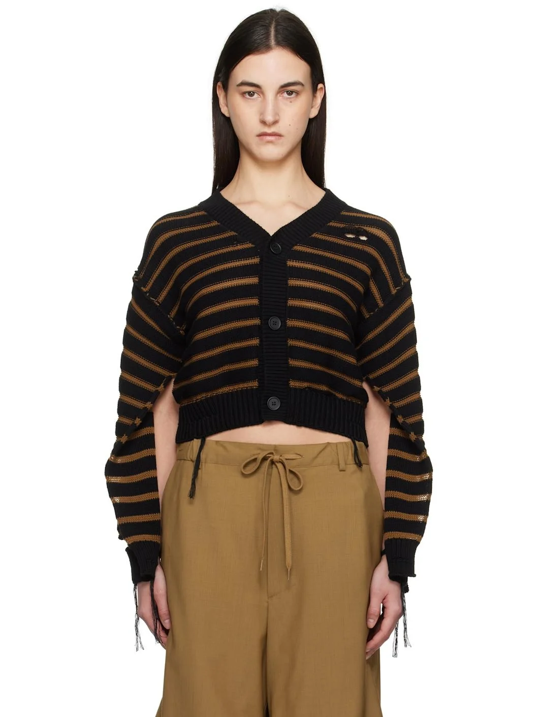 5-gauge knit cotton cardigan. Distressing throughout. · Rib-knit Y-neck, hem, and cuffs · Button closure · Dropped shoulders · Slit at sleeves · White stitching at back collar Supplier color: Black/Brown clay 100% cotton. Made in Italy 251188F095002