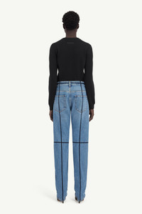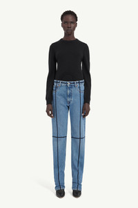 Inspired by the atelier, these jeans offer a creative play on classic denim. Exaggerated seams mimic the guiding lines of a dressmaker’s mannequin, transforming a classic straight-leg fit into an exploration of proportion. The MM6 white stitch line at the back subtly marks the Maison’s unconventional approach to construction. Product Details Item ID S52LA0261M30018967 Primary Fabric: 100% Cotton Pocket Lining: 65% Polyester 35% Cotton Straight-leg denim trousers Contrast topstitching in vertical and horizontal lines Classic five-pocket construction Belt loops White stitch line at the back Made in Italy Model is 180 cm tall and wears a size 28.