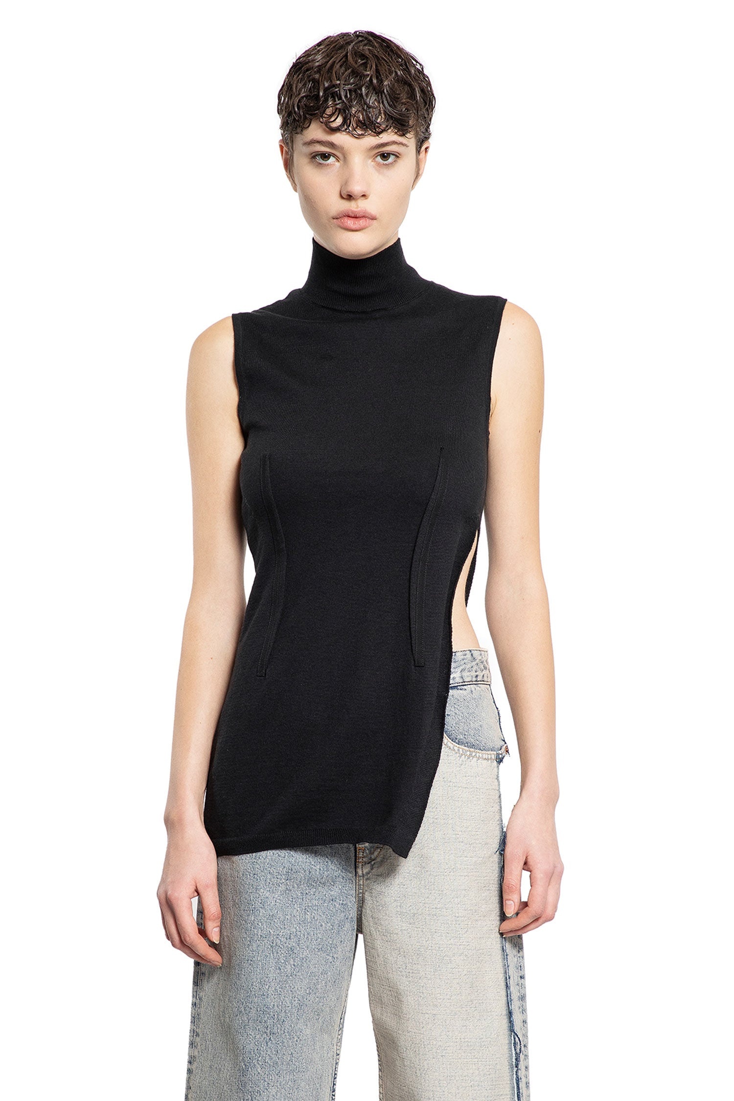 DESCRIPTION - Black - Cotton wool knit - Turtleneck - Sleeveless - Back stitch moniker - Side split - Elongated hem DETAILS - Made in: Italy - Composition: 85% Cotton 15% Wool - Model code: S52NC0337M13043 900 - Item ID: 9316666605910 SIZE & FIT Model wears size S Model Height 178 cm Bust 85 cm Waist 73 cm Hips 92 cm