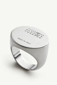 A minimalist gesture with symbolic weight. This oval signet ring is engraved with the Maison’s numeric artwork – anchoring MM6’s irreverent spirit within the conventions of classic jewellery. Its polished finish and tapered band reflect a refined approach to everyday subversion. Product Details Item ID SM7UQ0119P8755951 Primary material: 100% Silver-toned brass Polished oval signet ring Debossed numeric logo at face Tapered band Made in Italy