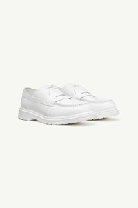 White vintage smooth leather gives the MM6 x Dr. Martens moccasin silhouette a restrained yet distinctive update. Subtle deconstruction and the signature sole create a seamless dialogue between heritage and innovation, offering a refined take on classic design. Product Details Item ID S66WR0029P8031HB009 Upper: 100% Calf Leather Contrast: 100% Calf Leather Lining: 50% Polyamide-Nylon 50% Polyurethane Inside: 100% Calf Leather Sole: 100% Polyvinylchloride Mocassin in smooth leather Dr. Martens sole