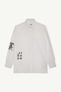 Part of the MM6 Spiga Capsule, this cotton poplin shirt reworks the Maison’s numeric signature. The logo is split and screen-printed across the sleeve and panels, aligning only when the garment is worn. Classic shirting is interrupted by this fragmented code, creating a graphic gesture that disrupts an archetypal piece. At the back, the MM6 horizontal stitch line confirms its identity. Product Details Item ID S62DT0048S76783101 Composition: 100% Cotton Lightweight white cotton poplin shirt Classic pointed collar Full front button placket Long sleeves with buttoned cuffs Straight hemline MM6 numeric signature on the side White stitch line at the back