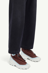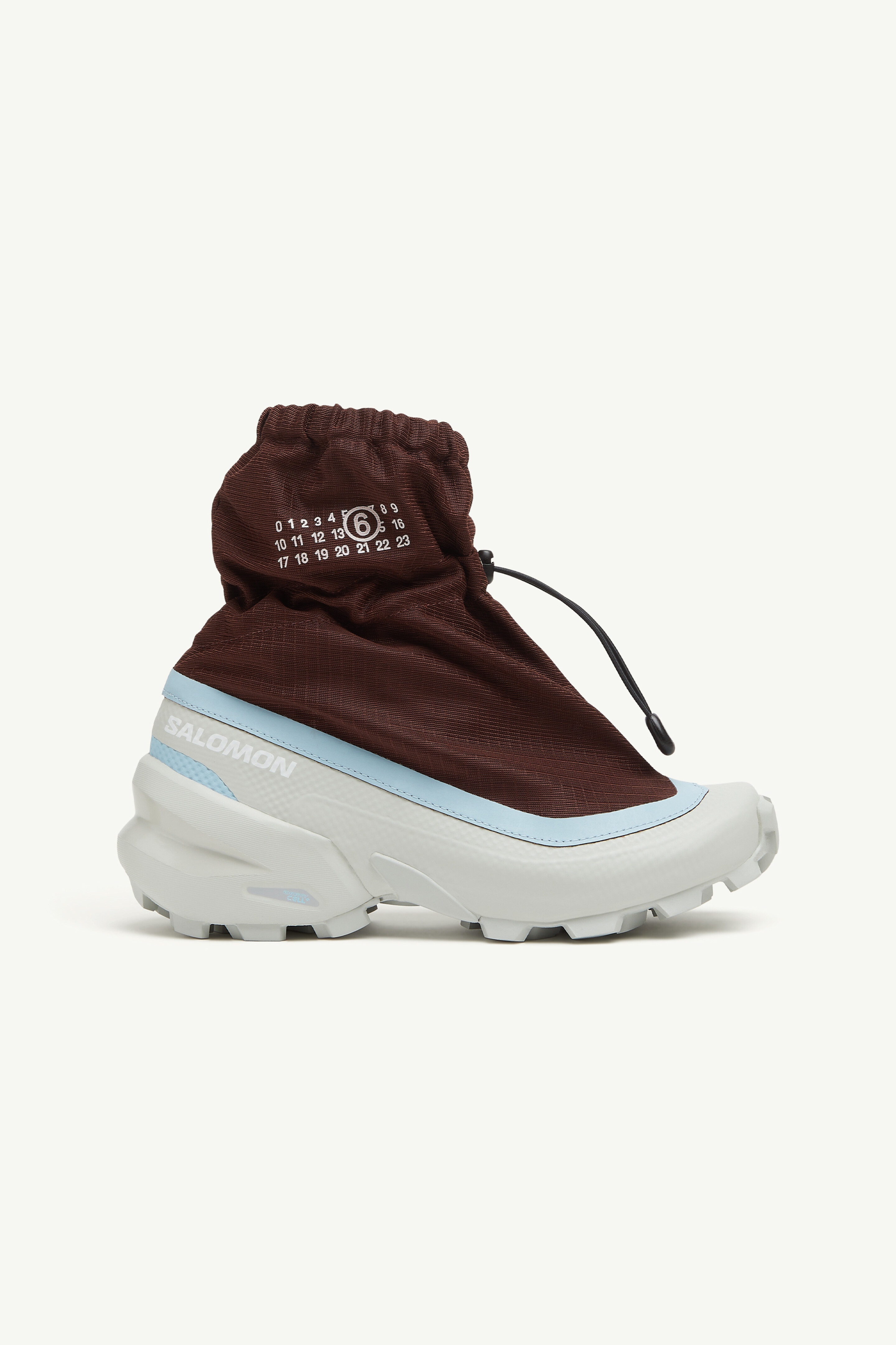 MM6 Maison Margiela x Salomon Cross High sneakers illustrate the capsule's hybrid perspective, marrying a progressive aesthetic with performance-ready credentials. Features such as a reinterpreted lug– derived from Salomon’s signature Speedcross pattern – and an inner mesh slip-on shoe nod to trail running heritage. MM6’s unconventional yet casual design ethos is seen with bold hues and a built-in ripstop gaiter, resulting in a distinctly modern silhouette. The MM6 x Salomon collaboration speaks to the brands’ shared ethos of transitional design, first seen in the Maison’s Autumn/Winter 2022 show. Drawing inspiration from the everyday, the collection is a celebration of the unsung beauty of quotidian dressing; of the eclectic blur of clothes that pass us by on our city streets. Product Details Item ID S59WS0217P5744H9595 Upper: 100% polyester Contrast: 100% polyurethane Lining: 100% polyester Inside: 100% polyester Sole: 100% rubber Synthetic MM6 x Salomon cross mid sneakers Elastic closure MM6 numeric signature at the front
