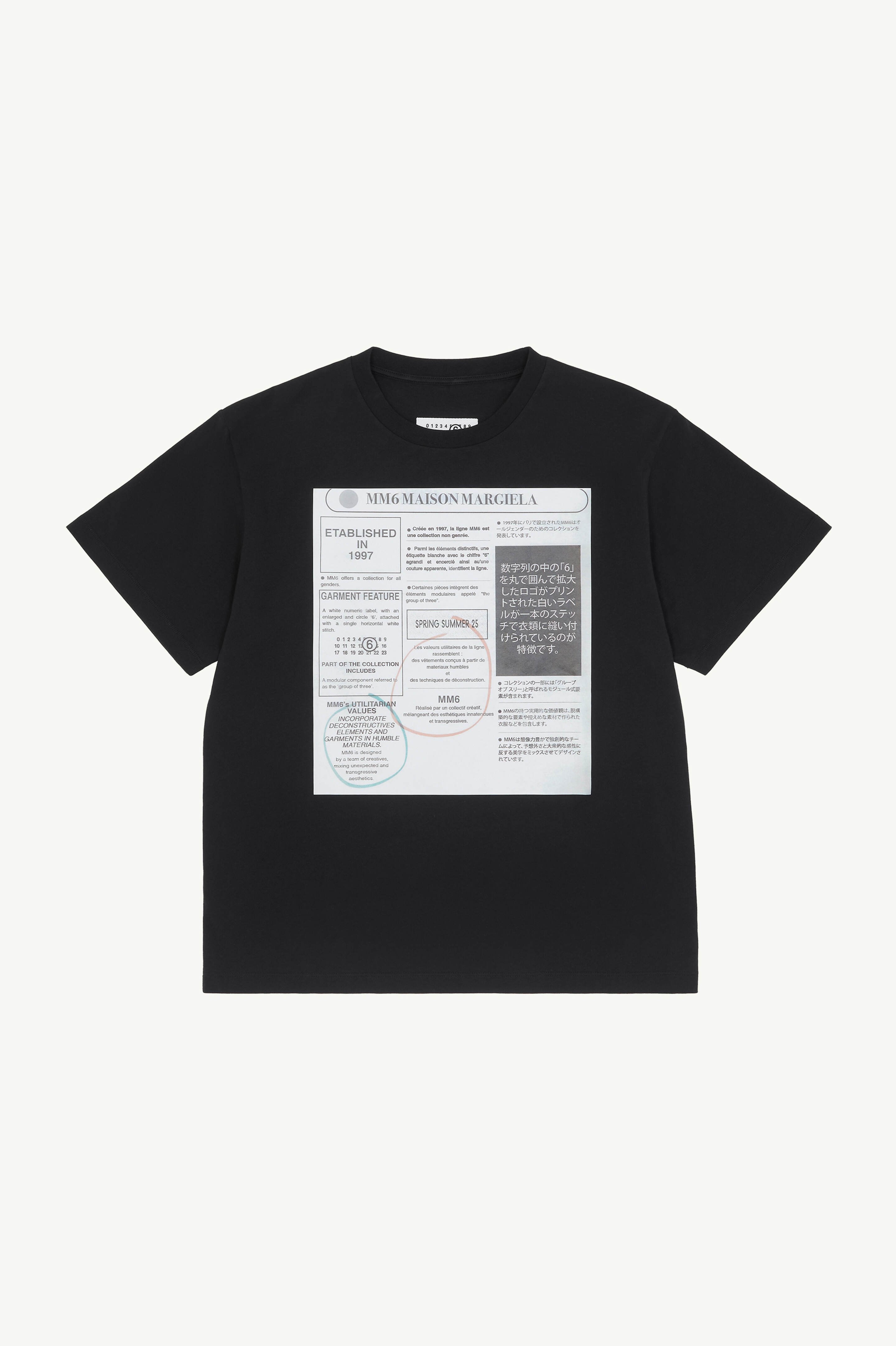 Offering a seasonal take on an everyday staple, this modern T-shirt features newspaper-style artwork at the front, inspired by the iconic MM6 archive print. The classic crewneck and regular fit provide a versatile base, while the white stitch line at the back highlights the Maison’s distinctive identity. Product Details Item ID S52GC0337S24312900 Composition: 100% cotton Cotton jersey T-shirt Crewneck Newspaper small print at the front White stitch line at the back Regular fit Made in Portugal