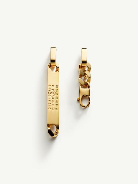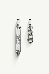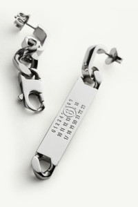 A study in asymmetry, this mismatched earring set balances contrast and cohesion. One earring is engraved with MM6’s numeric artwork, while the other features a fluid drop chain – an interplay of structure and movement that challenges conventional pairings. Product Details Item ID SM6VG0099P8371951 Composition: 100% brass One size Pair of earrings Brass craftsmanship Engraved brand logo Made in Italy