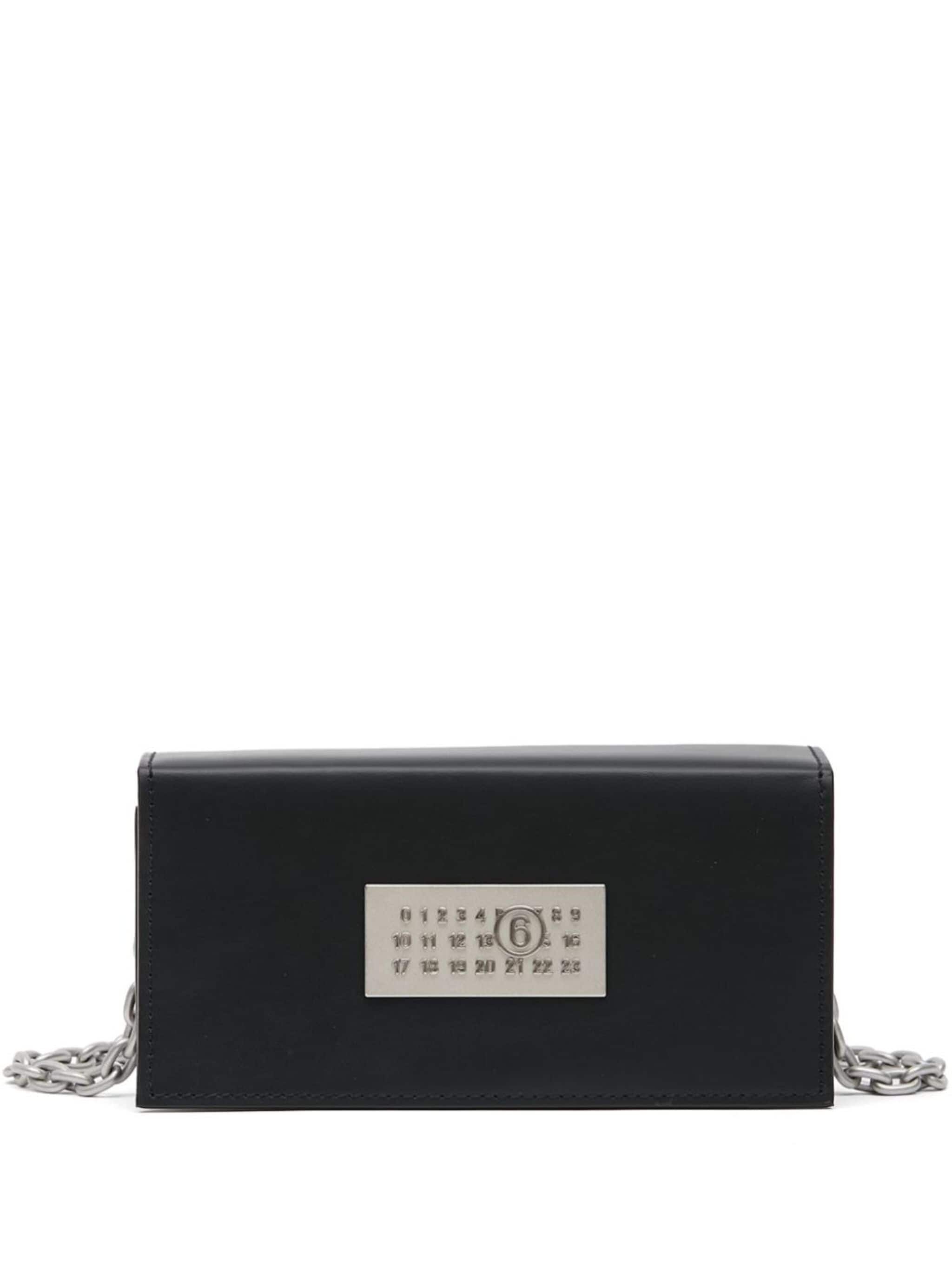 black calf leather smooth grain chain-link shoulder strap foldover top signature numbers motif plaque rear signature single-stitch logo main compartment internal card slots silver-tone hardware concealed magnetic fastening Size & Fit Model Measurements: Bust: 0cm Height: 0cm Hips: 0cm Waist: 0cm DEPTH: 3.5cm HEIGHT: 9cm STRAP: 60cm WIDTH: 18cm Fabric and Care Designer Style ID: SB6ZI0011P6418 Designer Colour: T8013 BLACK Composition: Outer: Calf leather 100%; Lining: Polyester 17%, Viscose 7%, Polyurethane 76%Made in Bulgaria