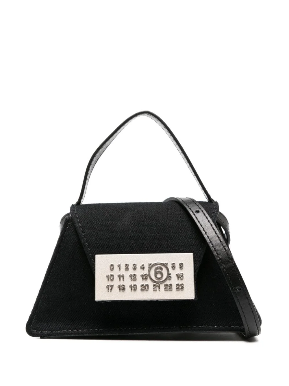 numbers-plaque mini bag Highlights - Black - Cotton - Twill weave - Silver-tone signature numbers plaque - Signature single-stitch logo - Foldover top with magnetic fastening - Single flat top handle - Adjustable detachable shoulder strap - Leather lining - Internal logo patch - Internal card slot - Main compartment - Silver-tone hardware - This piece comes complete with a protective dust bag. Made in Italy Composition Outer: Cotton 100%, Calf Leather 100%, Zinc 94%, Aluminium 4%, Copper 2% Lining: Polyurethane 76%, Polyester 17%, Viscose 7% SIZE & FIT Model measurements Height 5 ft 10 in(1.78 m) Bust/Chest 31.49 in(80 cm) Hips 37 in(94 cm) Waist 23.62 in(60 cm) Measurement DEPTH 1.96 in(5 cm) HANDLE 2.36 in(6 cm) HEIGHT 3.54 in(9 cm) STRAP 47.24 in(120 cm) WIDTH 5.51 in(14 cm)