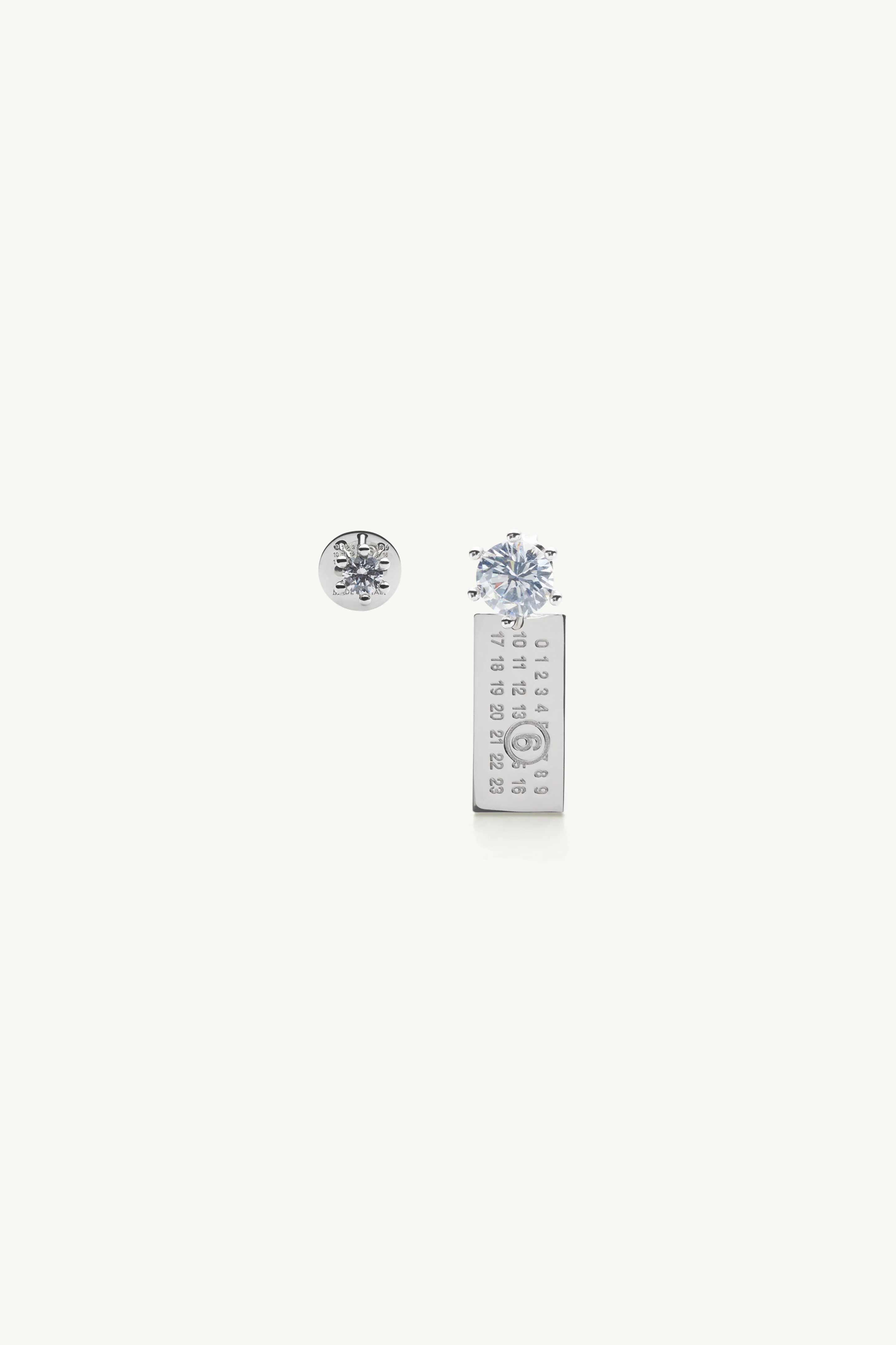 Designed as an asymmetric set, this earring pairing juxtaposes a clean stud with a hanging numeric charm. The engraved plaque brings a graphic edge to the silhouette, while the restrained hardware keeps the focus on proportion, contrast, and the Maison’s emblematic numbering. Product Details Item ID SM7VG0117P9162951