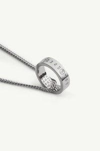 Intricately engraved with the iconic MM6 numeric signature at the forefront, this silver-finished brass necklace embodies the Maison's subtly rebellious aesthetic, blending minimalist design with contemporary edge. A statement piece, it underscores MM6's dedication to meticulous craftsmanship. Product Details Item ID SM6UU0048P7296951 Body: 100% brass One size Brass necklace Minimal ring pendant Engraved brand logo Avoid salt, chlorine water and aggressive liquid Made in Italy