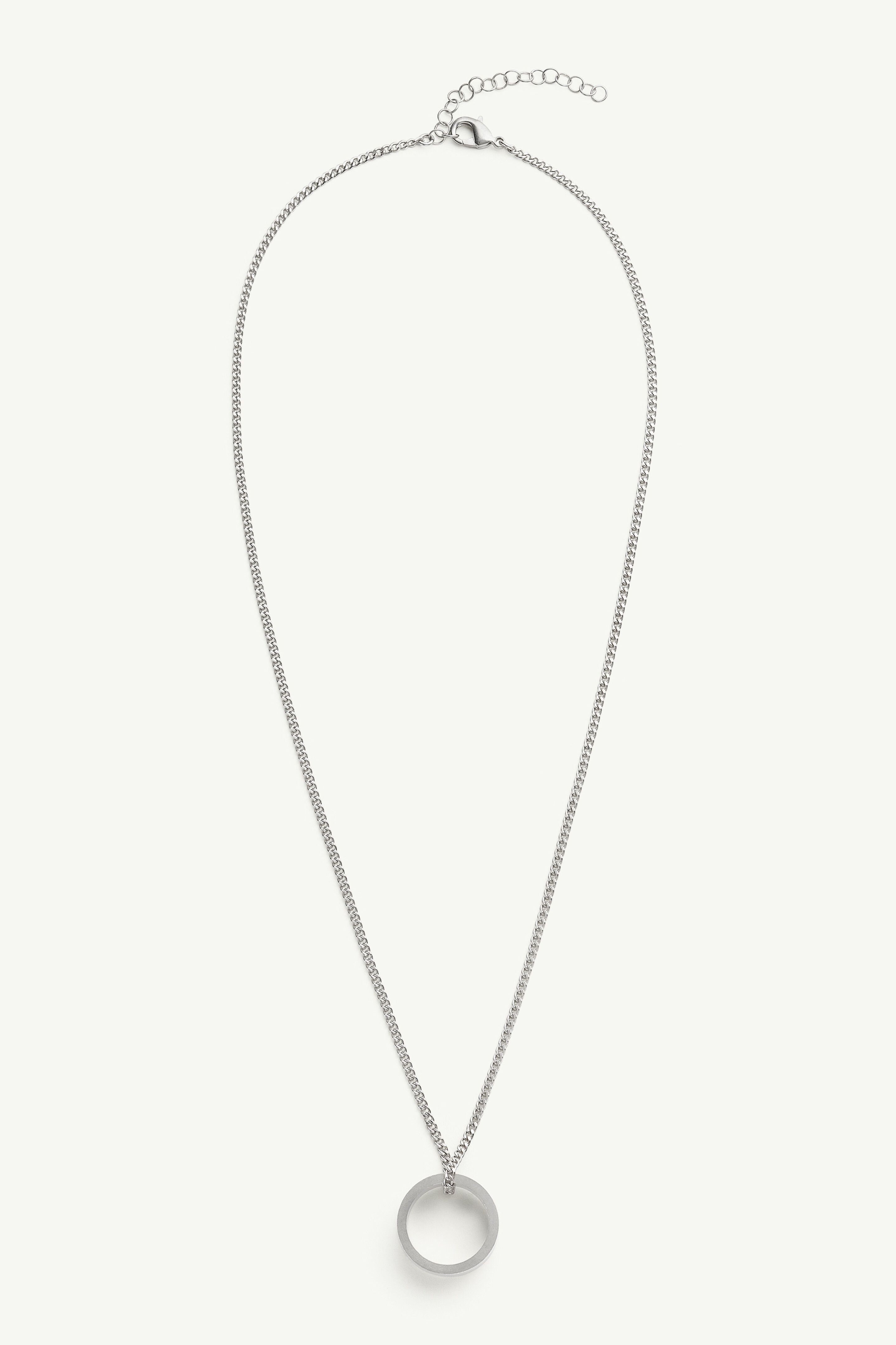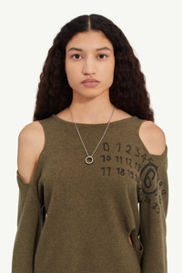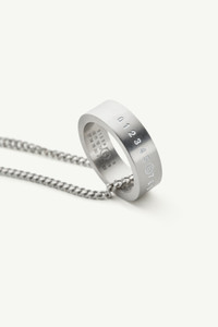 Intricately engraved with the iconic MM6 numeric signature at the forefront, this silver-finished brass necklace embodies the Maison's subtly rebellious aesthetic, blending minimalist design with contemporary edge. A statement piece, it underscores MM6's dedication to meticulous craftsmanship. Product Details Item ID SM6UU0048P7296961 Body: 100% brass Ring width: 8 mm Necklace in brushed silver Pendant logo ring Engraved MM6 numeric signature at the front Made in Italy The item comes in a white zipped bag