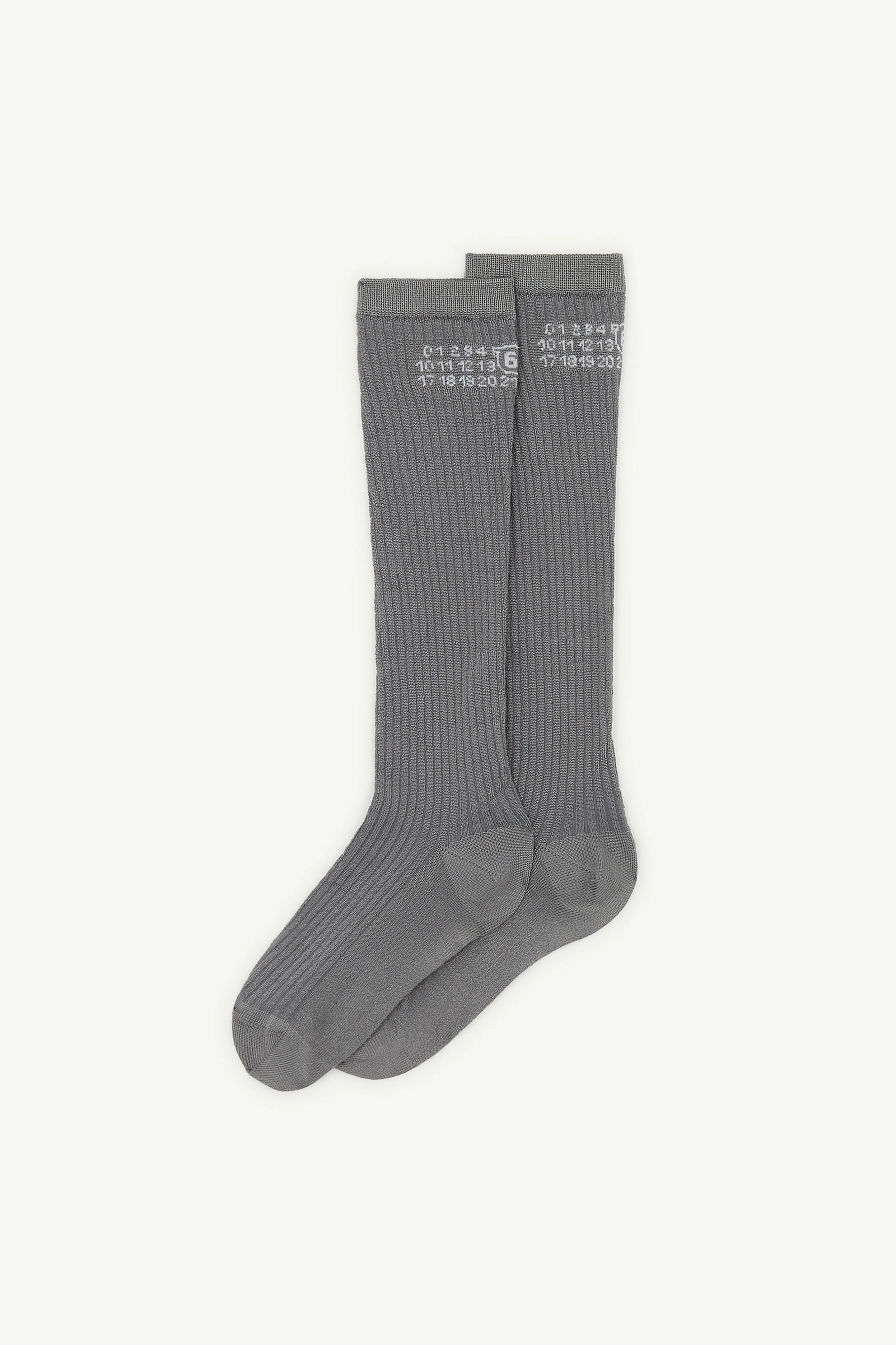 Clean and minimal, these ribbed socks are cut in a classic crew length. The MM6 numeric artwork is printed at the calf, adding a subtle signature. Product Details Item ID S62TL0045M13204852 Primary fabric: 80% Viscose-Rayon, 15% Polyamide-Nylon, 5% Elastane-Spandex Ribbed cotton-blend socks Contrast numeric logo at both calves Crew length