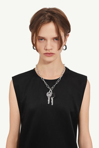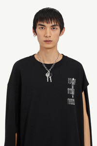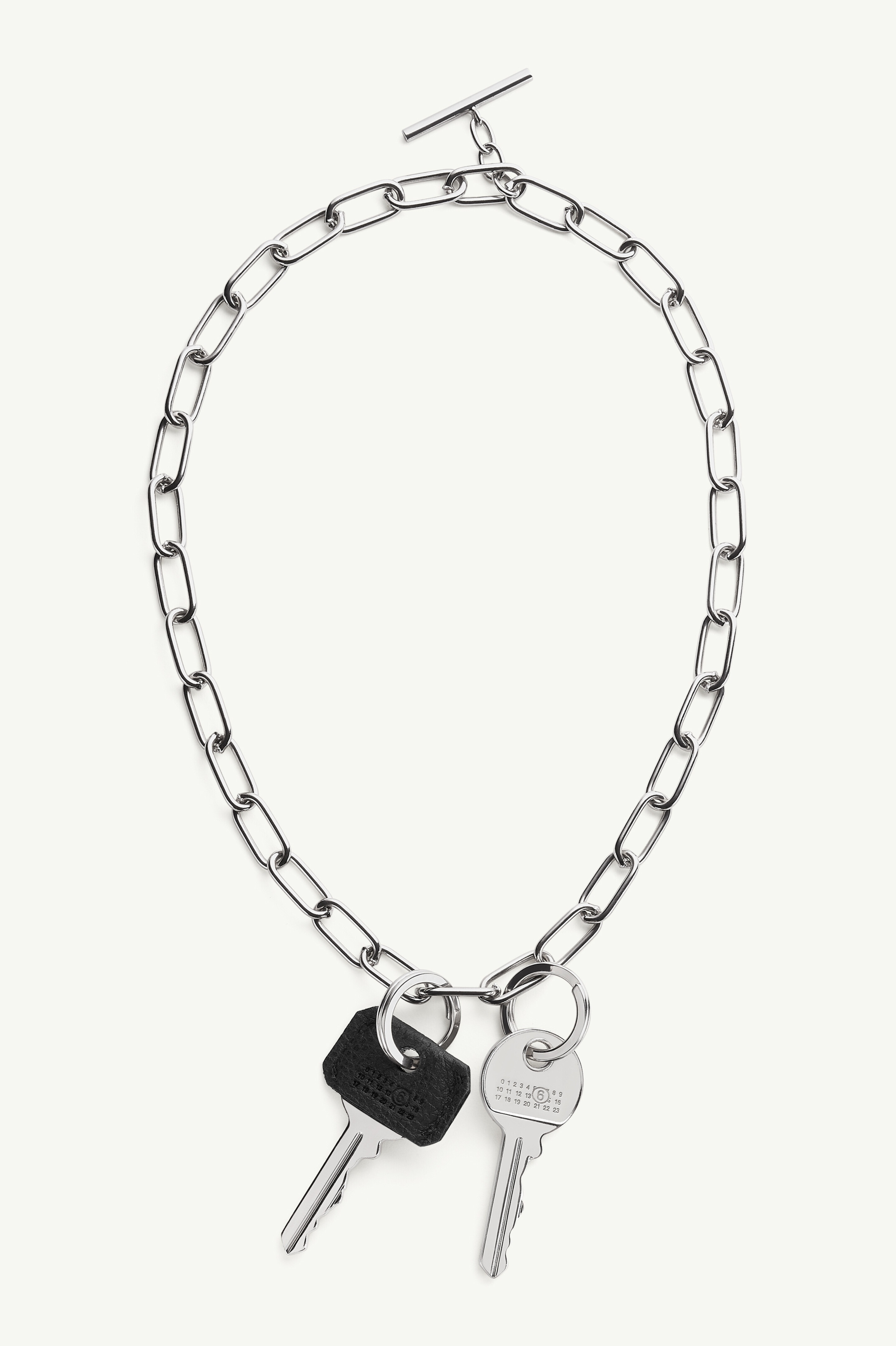 MM6’s necklace is crafted from brass and displays a leather covered key pendant held by a silver necklace. The brand’s numeric signature is engraved on the front of the pendant. Product Details Item ID SM7UU0061P6615963 Body: 25% steel, 25% cellulose, 25% brass, 25% calf leather Chain necklace in leather covered polished silver MM6 numeric signature at the front Made in Italy The item comes in a white zipped bag