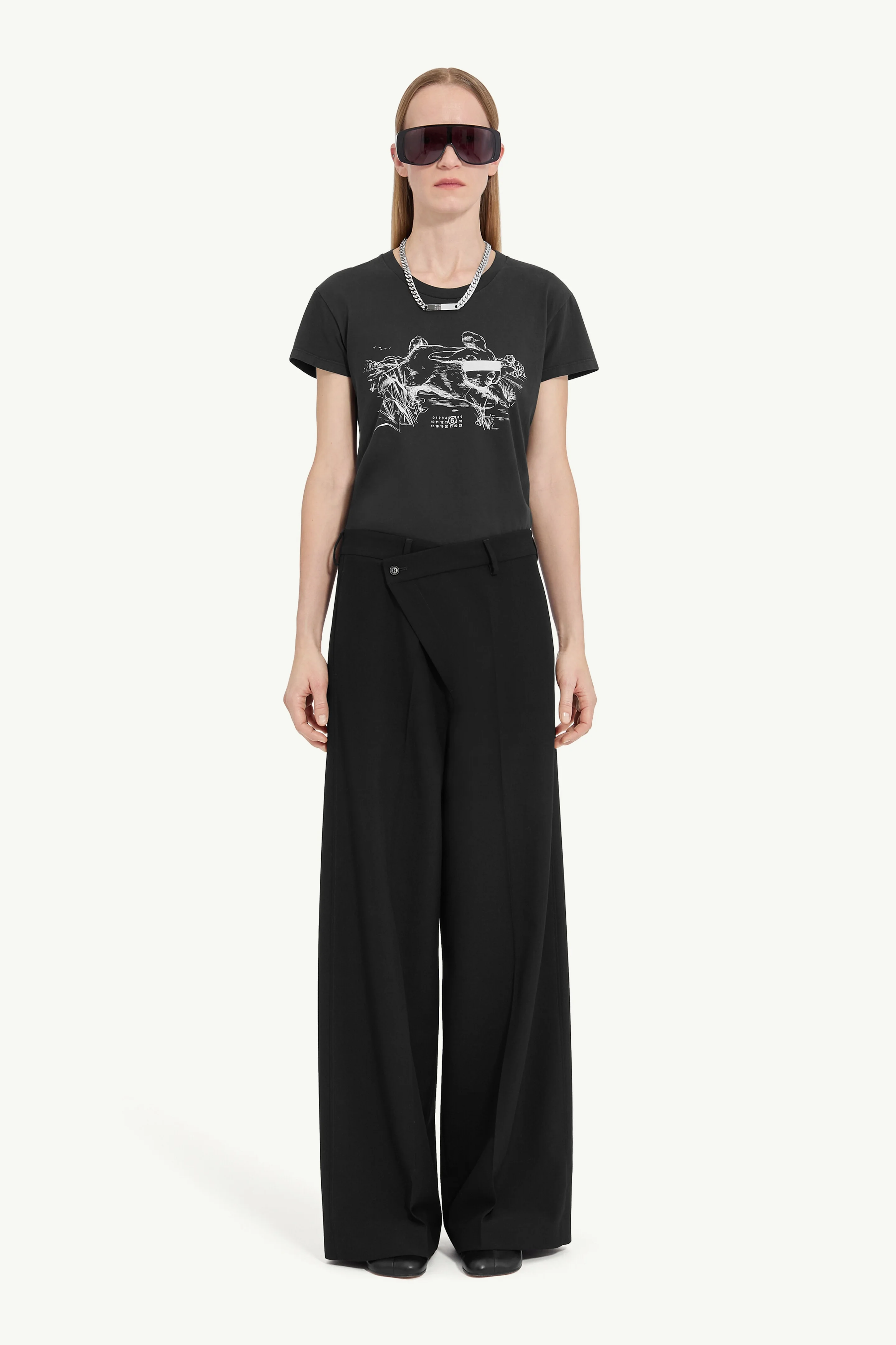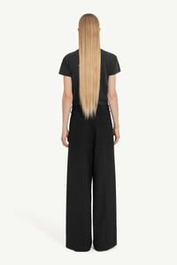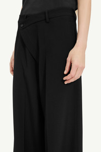 In a fine wool blend, these tailored trousers introduce small disruptions to a familiar form. The crossover button closure tilts convention off-centre while belt loops affirm utility, leaving a refined silhouette that embraces subtle disorder within timeless tailoring. Product Details Item ID S62KB0222M35436900 Primary Fabric: 55% Polyester 45% Virgin Wool Pocket Lining: 100% Viscose-Rayon Light wool blend trousers High waisted Asymmetric front panel detail with a button closure Belt loops Wide leg White stitch line at the back Made in Italy