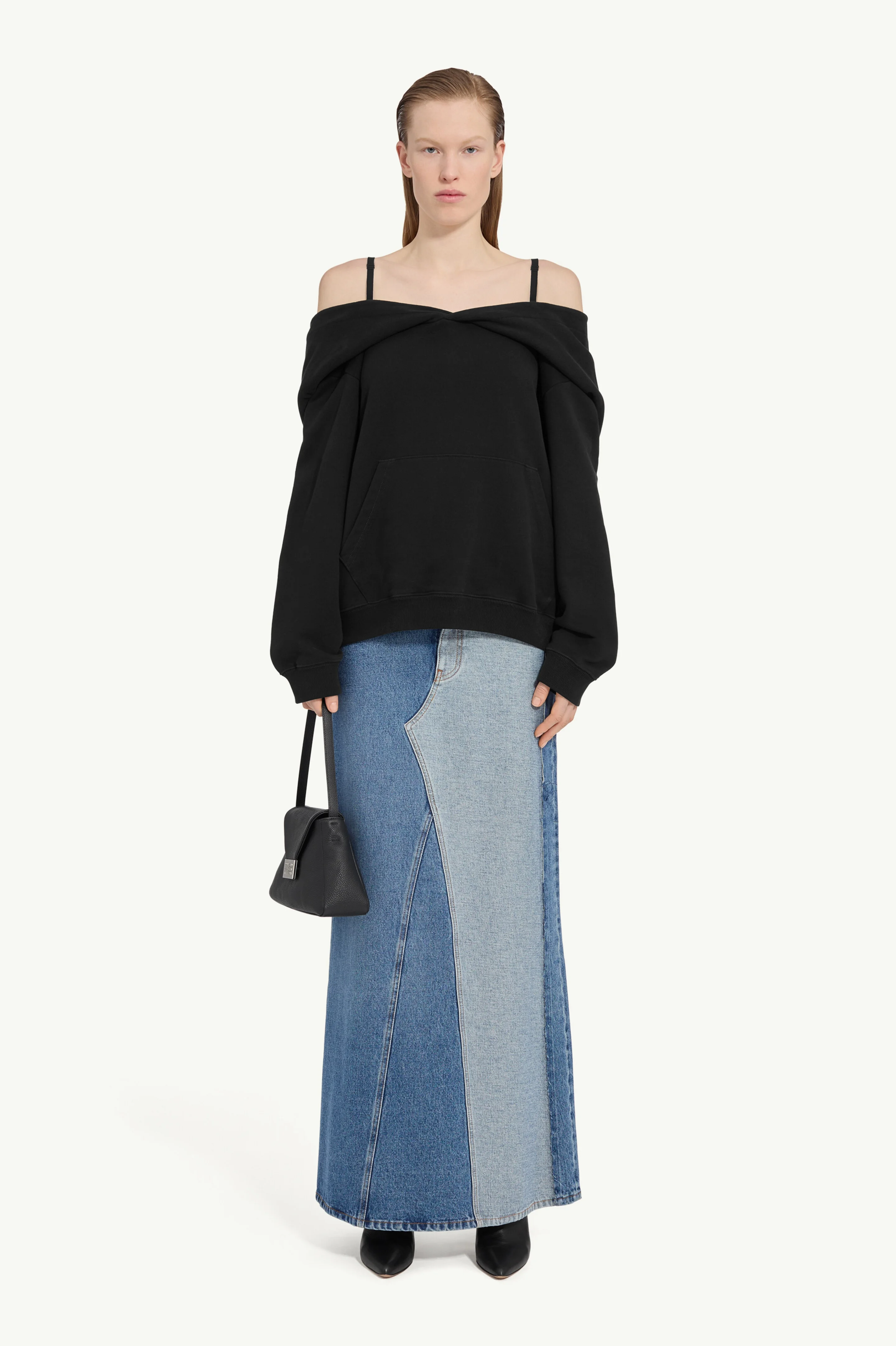 A radical reinterpretation of the classic hooded sweatshirt, this piece deconstructs loungewear with an off-shoulder silhouette. The oversized hood transforms into a draped neckline, offering multiple styling possibilities, while ribbed trims anchor the fluidity. Finished with MM6’s signature white stitch line at the back. Product Details Item ID S52GU0244M25014900 Primary fabric: 100% Cotton Off-shoulder sweatshirt with a hood Off-shoulder neckline with collar Long sleeves with ribbed cuffs Kangaroo front pocket Ribbed hemline details Large attached hood at the back Visible stitching on seams White stitch line at the back Made in Italy Model is 180 cm tall and wears a size M.
