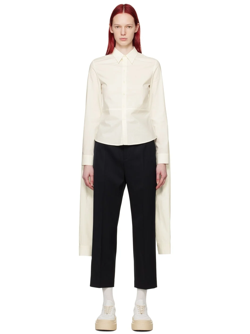 Cotton poplin shirt. · Spread collar · Button closure · Curved hem · Three-button barrel cuffs · Layered extended sleeves for alternate styling · White stitching at back collar · Mother-of-pearl hardware Supplier color: Off white 100% cotton. Made in Italy 241188F109029