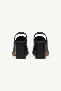 A continuation of the Anatomic line, the slingback silhouette is introduced with signature design details. Leather uppers frame the sculpted open toe, offset by a wide elastic strap marked with the Maison's numeric artwork. Elevated by a curved round heel and finished with the MM6 white stitch line at the back. Product Details Item ID S59WP0213P3628T8013 Upper: 100% ovine leather Contrast: 74% polyester 26% rubber Lining: 100% calf leather Inside: 100% calf leather Sole: 100% calf leather Contrast: 100% rubber Cylindrical heel Sandals in nappa leather Tabi split toe Made in Italy