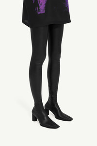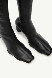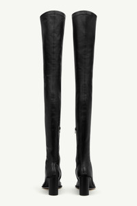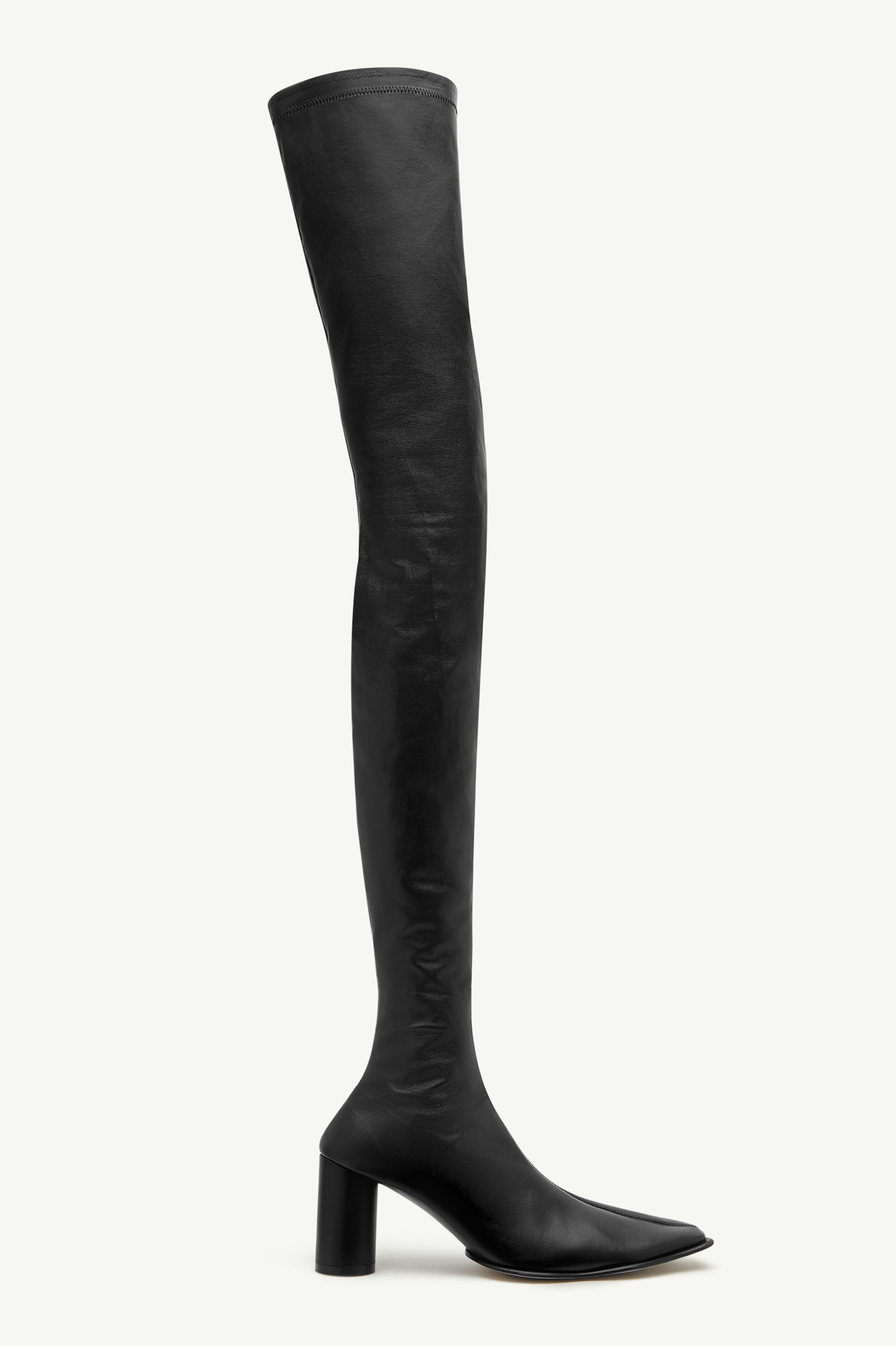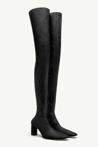 True to the spirit of early British punk, these over-the-knee boots highlight a striking block colour that emphasises their bold, edgy silhouette. MM6's signature white stitch line at the back completes the design, embodying the brand's ethos of nonconformist elegance. Product Details Item ID S66WW0089P7973T8013 Upper: 61% polyester, 32% polyurethane, 7% elastane-spandex Lining: 100% calf leather Inside: 100% goat leather Sole: 100% calf leather Heel height: 7,5 cm/3 in Boots in stretch synthetic nappa Elongated anatomic toe shape White stitch line at the back Made in Italy