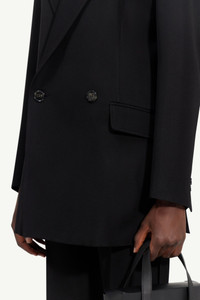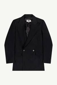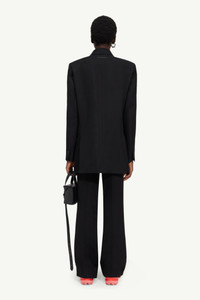 Oversized blazer crafted from a wool gabardine blend with two buttons, a large notched collar and flap pockets. MM6’s discreet yet distinct signature, a horizontal line of white stitches, is found on the back of the garment.