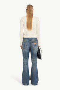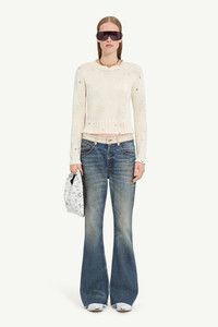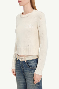 A ribbed round-neck knit flecked with paint residue and bearing distressed marks that unsettle its otherwise familiar form. The artisanal touches, along with the Maison’s white stitch line at the back, signal a garment caught mid-creation, a controlled imperfection that resonates with MM6’s ethos of reinterpretation and gradual evolution. Product Details Item ID S62HL0034M13123102S Primary Fabric: 75% Cotton 20% Polyester 5% Other Fibers Mixed cotton jumper Crewneck Front MM6 numeric signature Distressed details Ribbed trims White stitch line at the back Made in Italy