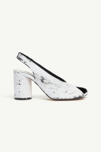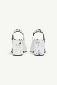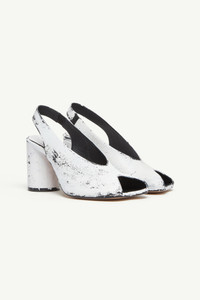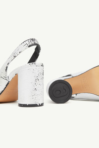 MM6’s anatomic sandals are creatively recast in white paint, their sculptural form taking on a bold, textural finish. Featuring a peep toe, slingback strap, and a block heel, this striking reinterpretation balances architectural precision with the Maison’s deconstructed aesthetic. Product Details Item ID S66WP0104P8306H5515 Upper: 100% Calf Leather Lining: 100% Calf Leather Inside: 100% Goat Leather Sole: 100% Calf Leather Heel height: 8,5 cm Shiny leather sandal Handpainted treatment MM6 anatomic shape Cylindrical heel White stitch line at the back Made in Italy