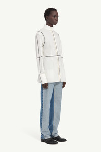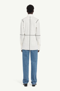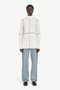 This long-sleeved shirt is made in cotton and features a high neckline and a sculpted fit, its contours shaped by seam lines that echo the markings of a dressmaker’s mannequin. A single white stitch line at the back leaves a subtle trace of the MM6 signature. Product Details Item ID S52DT0055M35256101 Primary fabric: 100% Cotton Long-sleeve shirt with stand collar High stand collar with buttons Concealed front placket with buttons Long sleeves, wide cuffs, button closure Visible seaming details with contrast piping Slightly flared hem, structured back panels White stitch line at the back Made in Italy Model is 180 cm tall and wears a size 42.