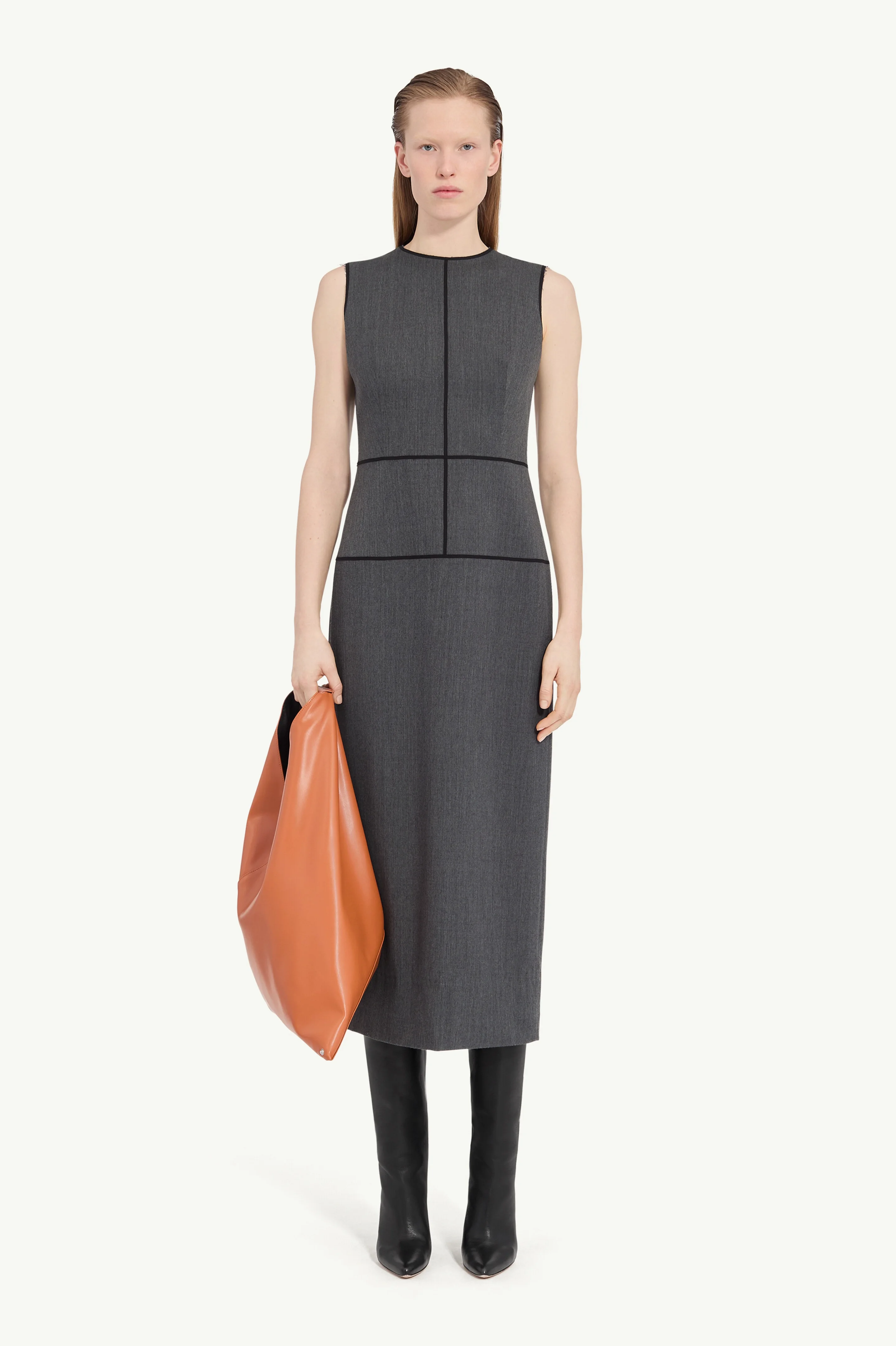 Cut for a minimalist yet sculptural effect, this midi dress is defined by its precise contrast binding that accentuates the structured panelling. The sleeveless design and high neckline enhance its streamlined appeal, while the back slit provides an unexpected reveal. Subtle raw edges at the armholes reinforce MM6’s deconstructed codes, finished with the iconic white stitch line. Product Details Item ID S52DG0029S47848860M Primary fabric: 54% polyester, 44% virgin wool, 2% elastane-spandex Lining: 100% viscose-rayon Sleeveless long dress with vertical and horizontal seam detailing Round neckline Back zip closure Rear vent at the hem White stitch line at the back Made in Portugal Model is 180 cm tall and wears a size 42.