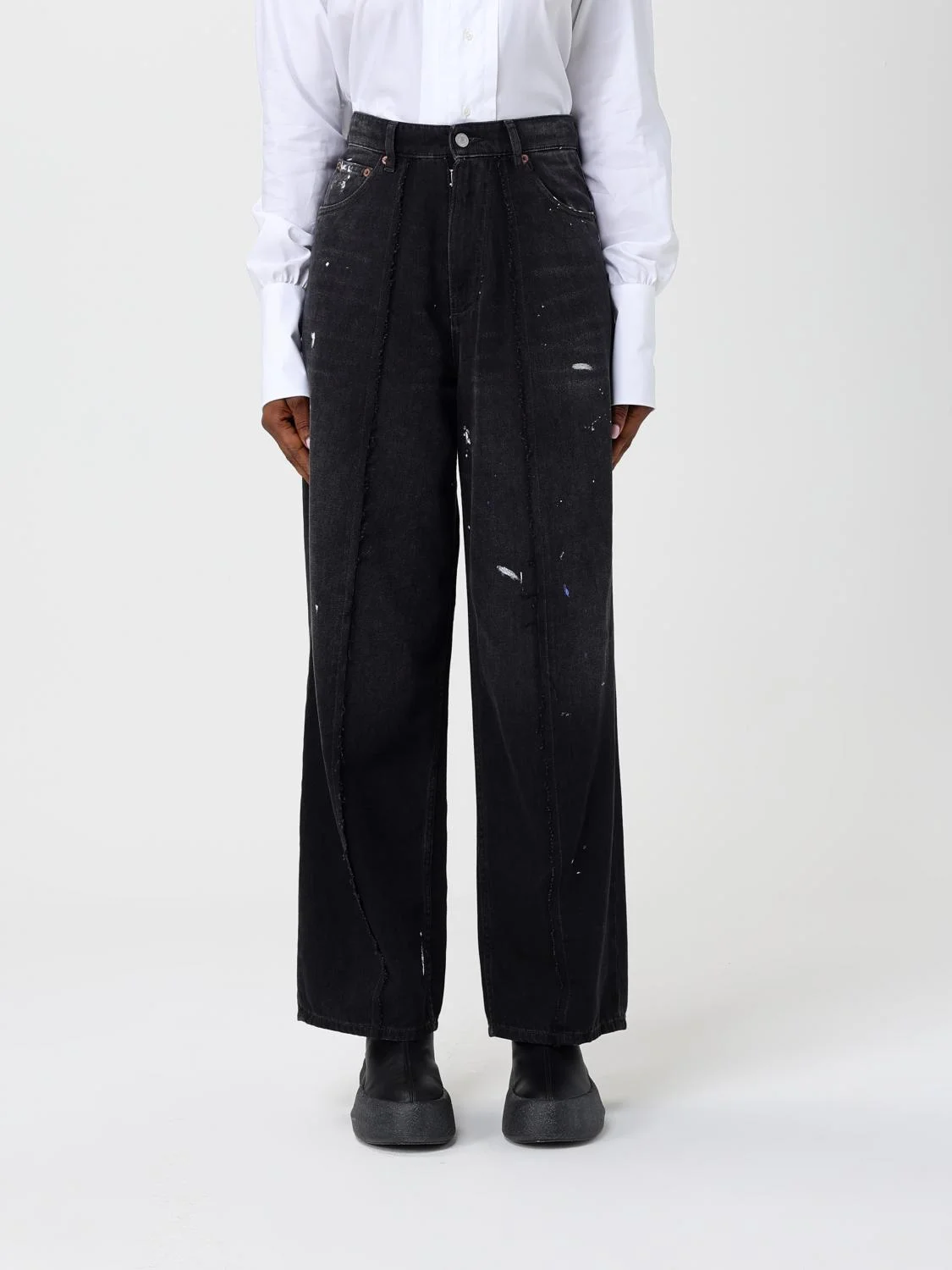 DESCRIPTION - Style: Urban-street - Pockets: 5-pocket - Waist: High waist - Bottom: With straight hemline - Closure: With button and zip - Materials: Cotton denim - Pattern: Abstract DETAILS AND CARE Composition not available SIZE AND FIT Sizes not available Size and fit Narrow leg Designer code: SH0LA0011M30011 966 Giglio Code: H45829 Designer: Mm6 Maison Margiela Collection: Mm6 Maison Margiela Woman Category: Clothing Mm6 Maison Margiela