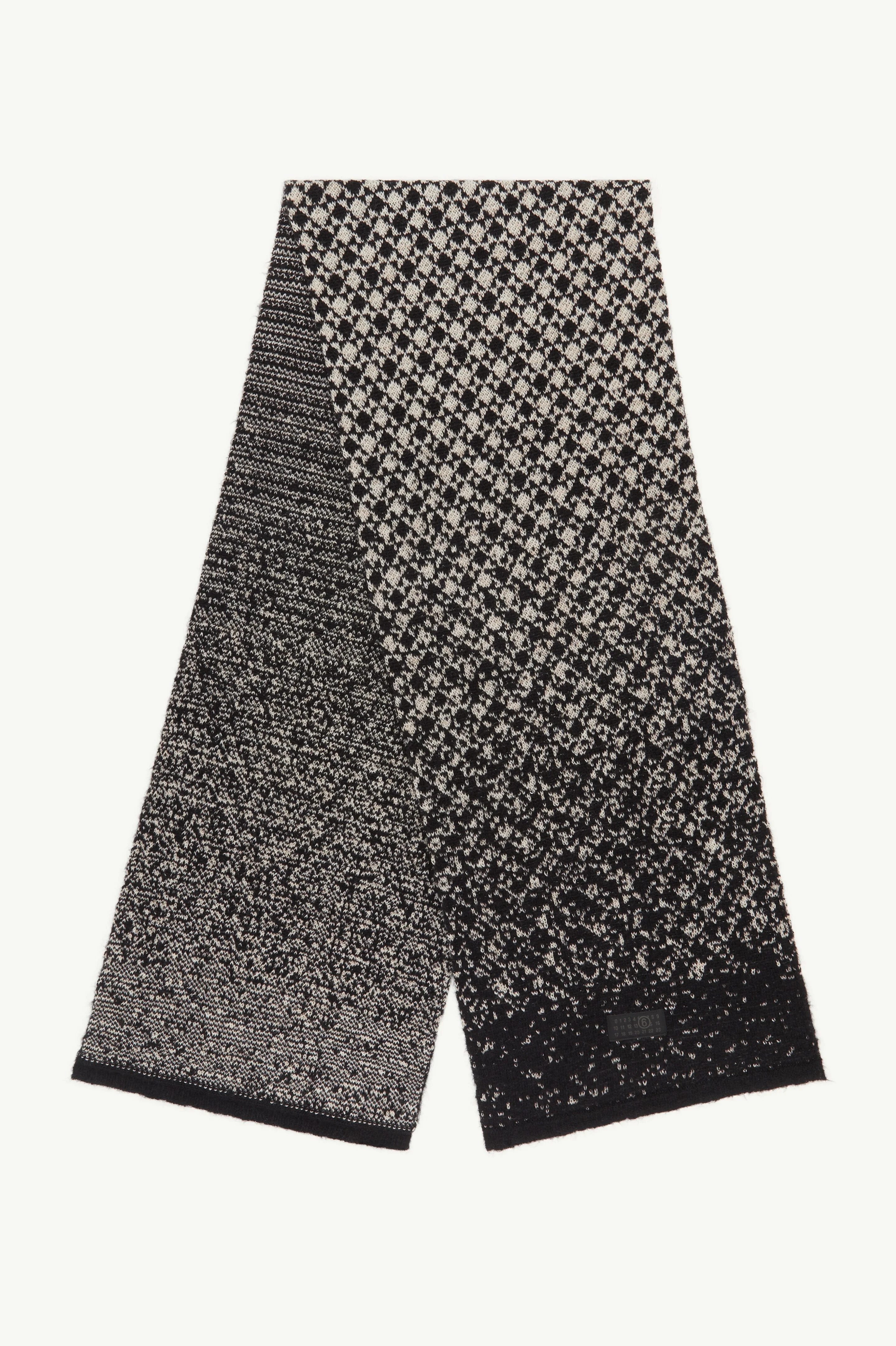 MM6 reimagines the Nordic knit as a textural gradient. Beginning with precision and fading into pixelated flux, the jacquard motif is intentionally unbalanced, grounded only by its weight and warmth. Oversized in scale, a tonal numeric patch affirms its MM6 origin. Product Details Item ID S52TE0057M13136001J Primary Fabric: 100% Wool Secondary Fabric: 44% Mohair 37% Polyamide-Nylon 19% Wool Jacquard-knit scarf in wool with a mohair blend Dissolving abstract pattern Numeric signature label Made in Italy