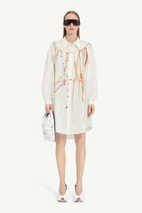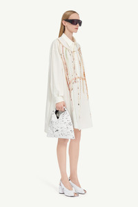 This oversized shirt dress calls forth a piece of Maison history, visually reproducing a pearl vest from the Spring/Summer 2006 archives. Beads and pearls, once integral to another era’s creation, now settle into a relaxed, contemporary silhouette. It’s a quiet dialogue across time, where the archival past informs a fluid, present-day form. Product Details Item ID S62CT0250M35462001S Primary Fabric: 100% Cotton Cotton poplin shirting dress Button closure Pearl print on the front Buttoned cuffs Asymmetrical hem White stitch line at the back Made in Italy