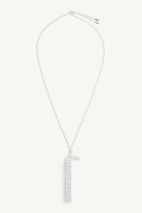 This found-object necklace extends MM6’s exploration of everyday items recontextualized. Bearing the word "invitation" and a tag engraved with the Maison's numeric artwork, it transforms a simple token into a subtle prompt – an open door to reinterpretation and dialogue. Product Details Item ID SM7UU0074P7352971 Body: 100% Brass Application: 100% Resin Application: 100% Cotton Brass necklace MM6 numeric signature tag at the front Made in Italy The item comes in a white zipped bag