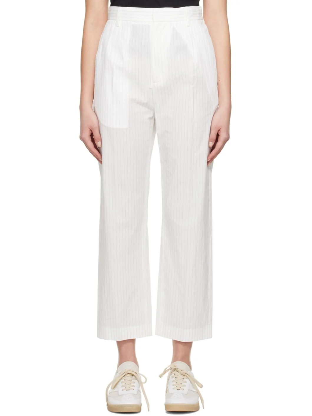 Plain-woven cotton trousers. Pinstripes throughout. · Belt loops · Three-pocket styling · Zip-fly · White stitching at back waistband Supplier color: Off-white