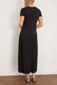 The MM6 Maison Margiela Short Sleeve Midi Dress with Pleated Skirt in Black is a short sleeve dress with pleated bottom half. FIT DESCRIPTION MODEL MEASUREMENTS - Fits true to size, take your normal size - Short sleeves - Long length - Crewneck - Pleated bottom half - Charley is wearing a size XS - Bust: 33” - Waist: 25” - Hips: 34” - Height: 5’8”