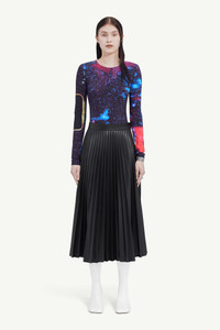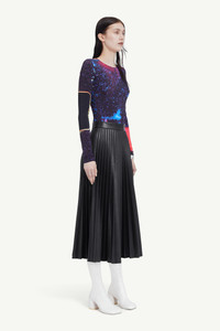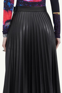 A-line skirt made with pleather. The style presents a pleated construction for fluid appeal. The waist is highlighted by its waistband with a button closure while a tonal horizontal stitch line is present on the back of the style, an MM6 discreet yet distinct signature. Product Details Item ID S52MA0192S54449900 Composition: 100% polyester Coating: 100% polyurethane Pleated faux leather midi skirt Side zip and button closure White stitch line at the back Made in Italy Model is 5'11" tall and wears a size 40.
