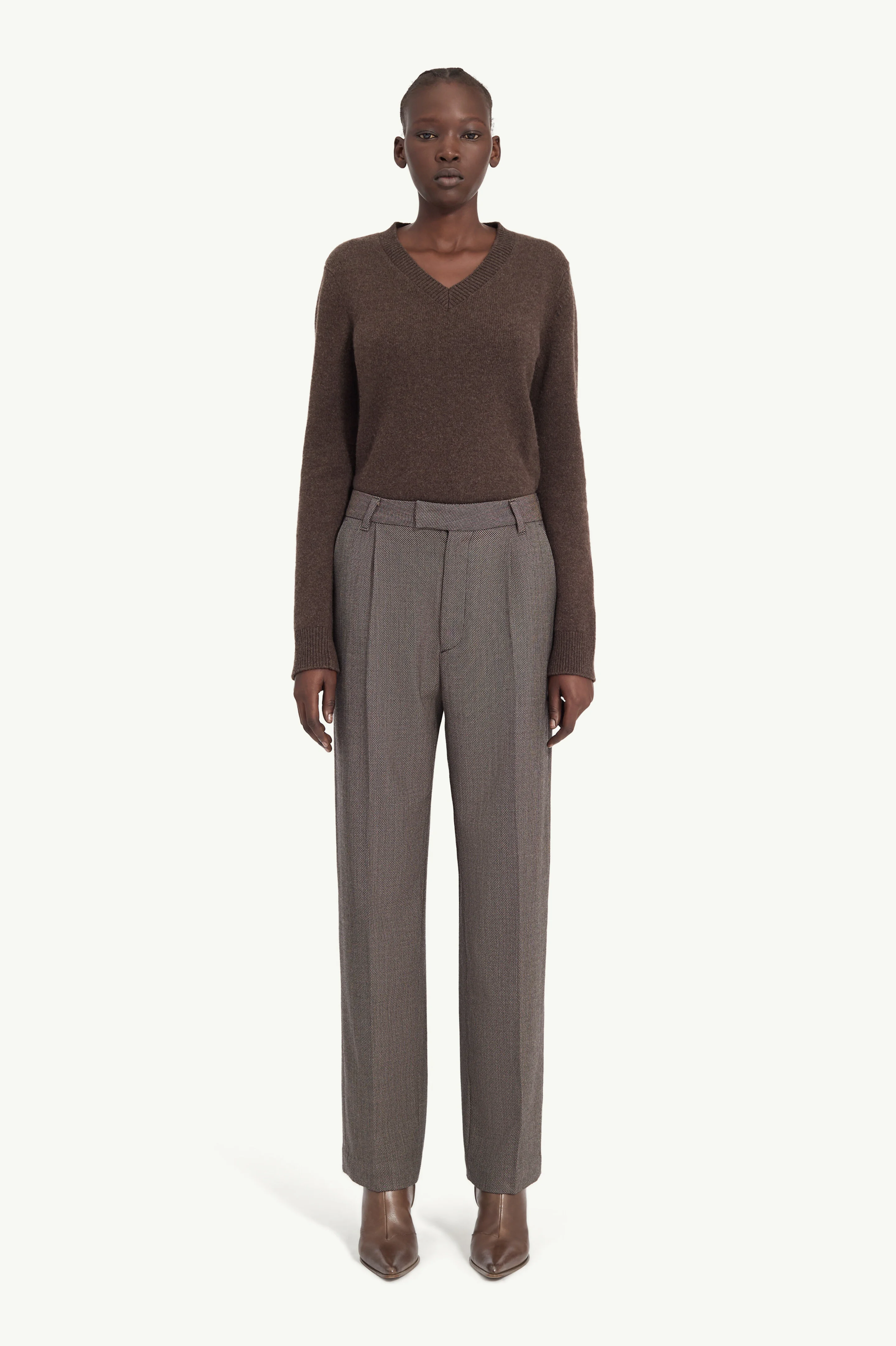 Tailored yet relaxed, these trousers reinterpret heritage dressing through a menswear-inspired cut. Pleated fronts, pressed creases and a wide-leg silhouette balance structure with ease – finished with the MM6 white stitch line at the back. Product Details Item ID S62KB0247M35636001F Primary fabric: 55% Polyester Secondary fabric: 45% Wool Wide-leg trousers in light tweed Pleated front and pressed creases Side slip pockets and back welt pockets Belt loops and concealed front fastening MM6 white stitch line at the back Made in Italy Model is 179 cm tall and wears a size 42.