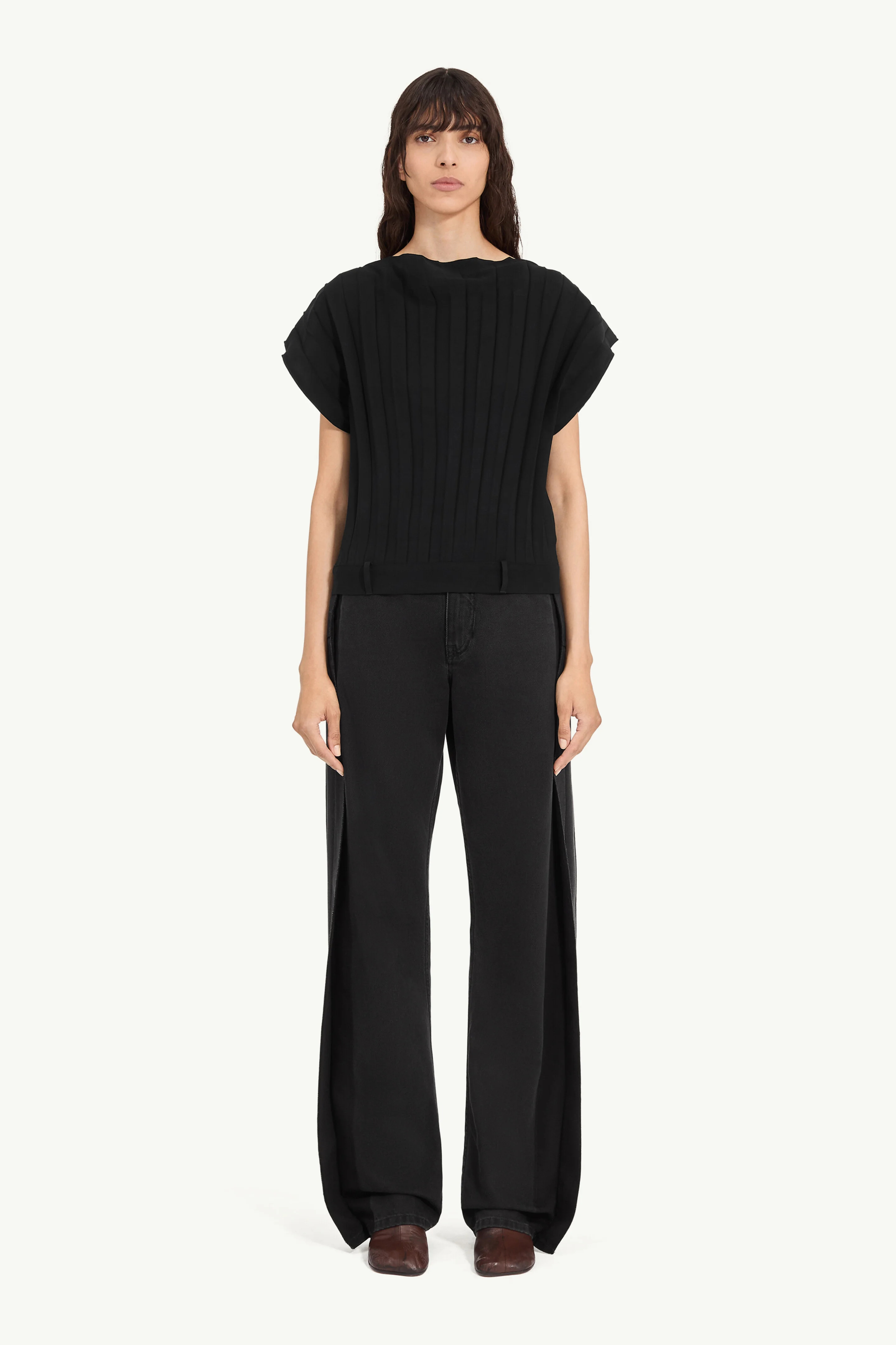 This sleeveless top is defined by vertical pleats that shape the form without constraining it. A tailored waist and capped shoulders suggest structure, offset by soft volume through the torso. At the back, a white stitch line highlights the MM6 signature. Product Details Item ID S62NC0177S43455900 Primary fabric: 100% Polyester Vertical pleated top Capped sleeves Waistband detail with belt loops White stitch line at the back Made in Italy Model is 178 cm tall and wears a size 42.