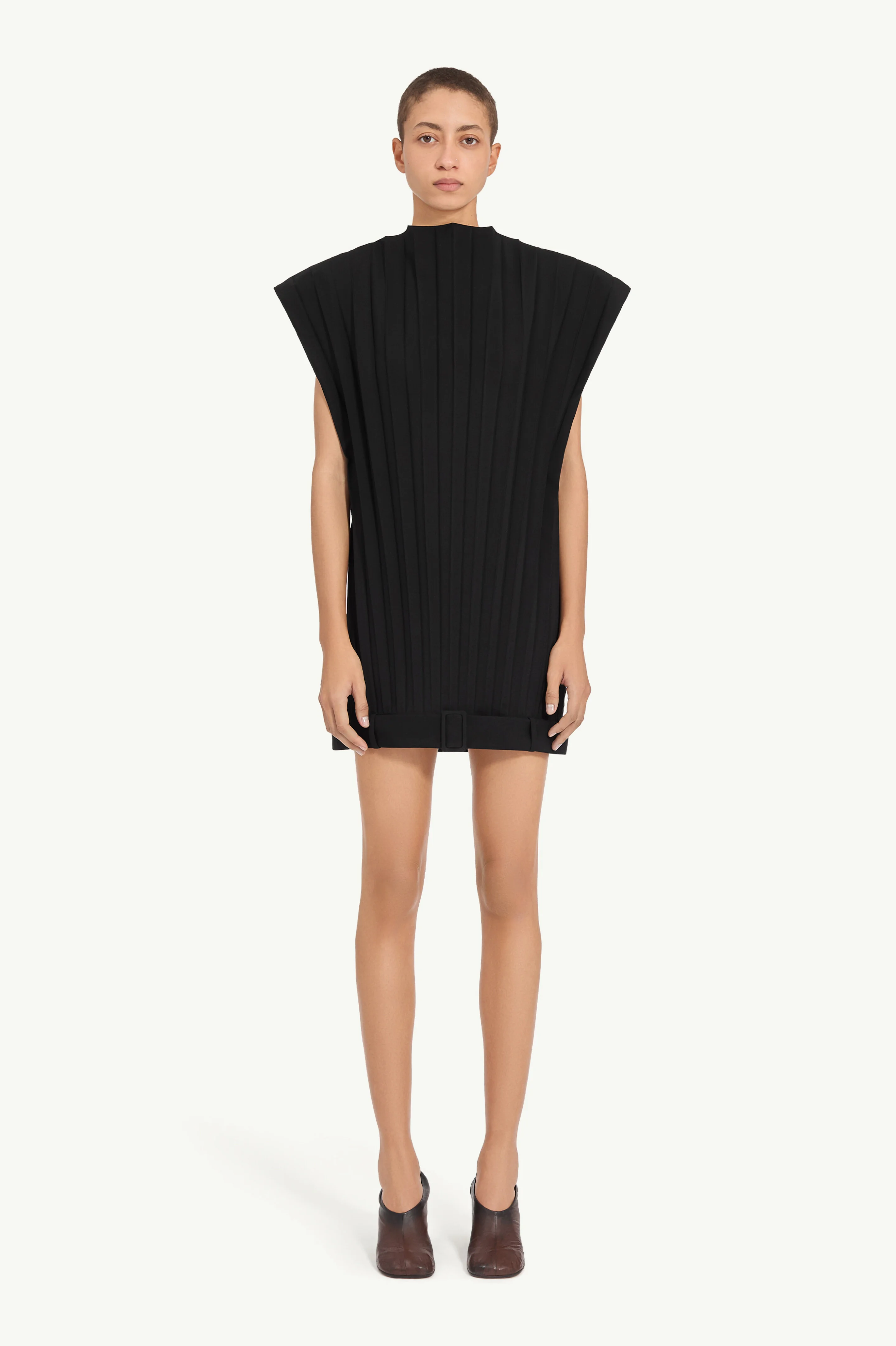 Inspiration from menswear tailoring meets 80s glam in this pleated wool-blend dress with architectural shoulders and a directional shape. Echoing the Maison's triangular archive silhouettes, the construction is reduced to its most essential lines. Finished with the MM6 white stitch line. Product Details Item ID S62DA0056M35436899 Primary fabric: 55% Polyester Secondary fabric: 45% Virgin Wool Pleated mini dress Extended shoulders Belt loop detail at the hem White stitch line at the back Made in Italy Model is 180 cm tall and wears a size 42.