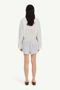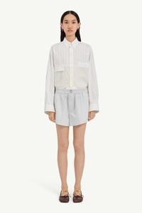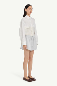 Crisp poplin cotton shorts, merging tailored precision with irreverent ease. The elastic waist and relaxed construction blurs boundaries between indoor and outerwear, embodying MM6’s subversive approach to wardrobe archetypes. At the back, the white stitch line affirms its signature. Product Details Item ID S52MU0134M35730001F Primary fabric: 100% cotton Pocket lining: 100% cotton Striped poplin shirt fabric Shorts with relaxed fit Elasticized waistband closure White stitch line at the back Made in Italy