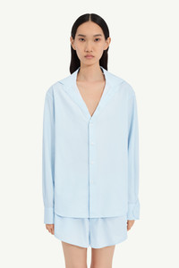 This cotton poplin shirt distills construction into its simplest form. Defined by a V-shaped neckline and stitched-down collar, it adopts the 2D technique to pare back dimension and exaggerate flatness. A minimal surface, subversively refined. Finished with the MM6 white stitch line at the back. Product Details Item ID S52DT0063M35480501 Primary fabric: 100% cotton Long sleeves Open shirt collar neckline Flat buttons closure at the front White stitch line at the back Made in Italy