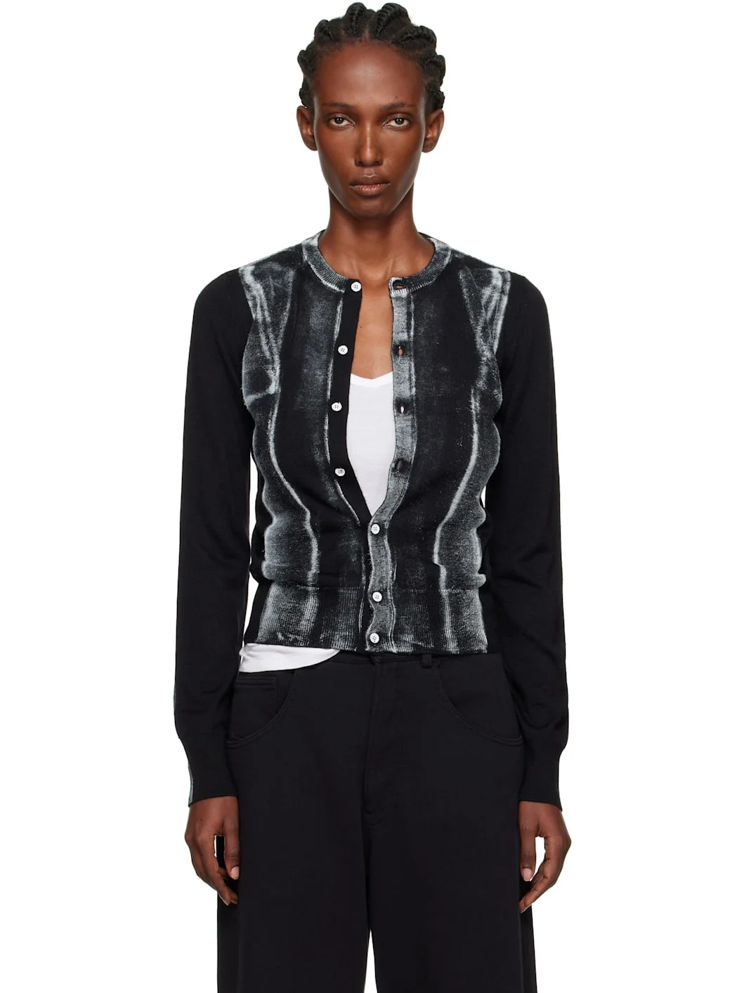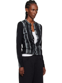 Knit virgin wool-blend cardigan. · Rib-knit crewneck, hem, and cuffs · Button closure · Spray-dyed detailing at front and sleeves · White stitching at back collar Supplier color: Black 50% virgin wool, 50% acrylic. Made in Romania 252188F095002