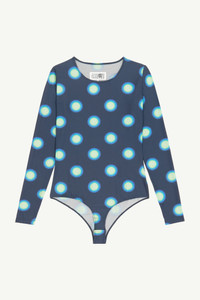 MM6’s printed bodysuit is cut from figure-skimming Lycra for a close, streamlined fit. The style also features a crew neck and long sleeves. The brand’s discreet yet distinct signature, a horizontal line of white stitches, is found on the back of the garment. Product Details Item ID S52NA0059S24685001F Composition: 84% nylon, 16% elastane Printed lycra body Crew neck Long sleeve White stitch line at the back Regular fit Made in Portugal Model is 178 cm tall and wears a size M.