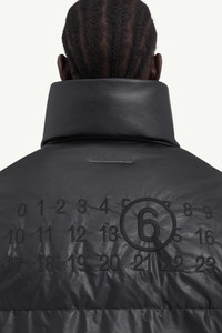 Jacket made with light pleather. The puffer design presents oversized proportions, a central seasonal theme, with accentuated front flat pockets and a high collar. The numeric signature is embroidered on the back Product Details Item ID S52AM0280S53057900 Composition: 100% viscose Coating: 100% polyurethane Lining: 100% viscose Padding: 100% polyester wadding Faux leather puffer jacket Zip closure High collar Adjustable hem with elastic Flap pockets MM6 numeric signature and white stitch line at the back Made in Italy Model is 6' tall and wears a size S.