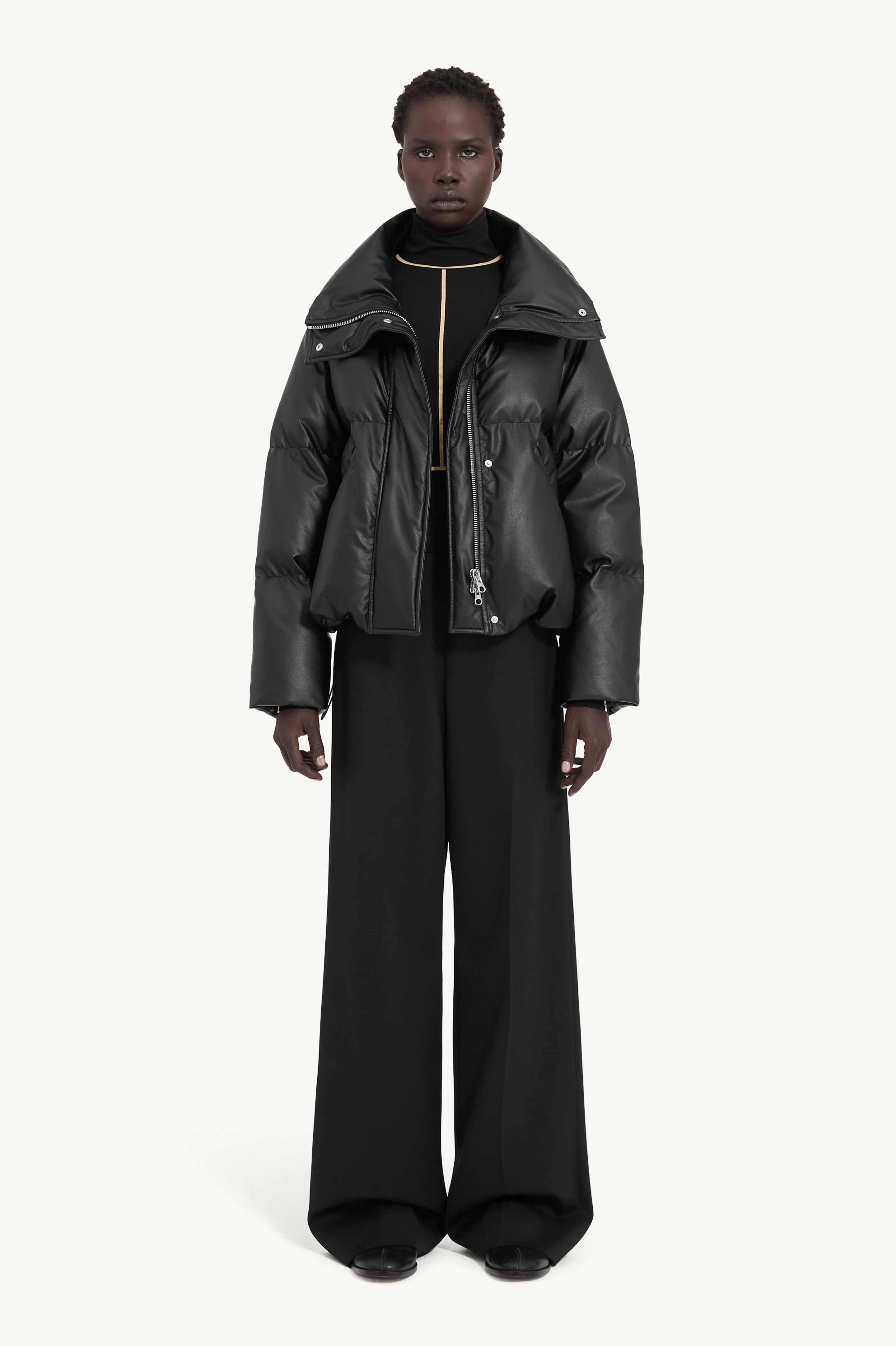 A fusion of technical function and MM6’s signature deconstruction, this padded jacket is reworked with an exaggerated stand collar and oversized proportions. Diagonal flap pockets add a utilitarian edge, while the Maison’s numeric artwork is subtly embroidered across the back. The white stitch line serves as a discreet yet defining mark of its identity. Product Details Item ID S52AM0338S53057900 Fabric: 100% viscose-rayon Coating: 100% polyurethane Padding: 90% duck down, 10% duck feather Lining: 100% polyamide-nylon Pocket lining: 100% cotton Puffer jacket with a high stand collar Oversized flap pockets Concealed zip and snap closure Embroidered numeric signature at the back White stitch line at the back Made in Italy Model is 180 cm tall and wears a size M.