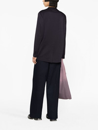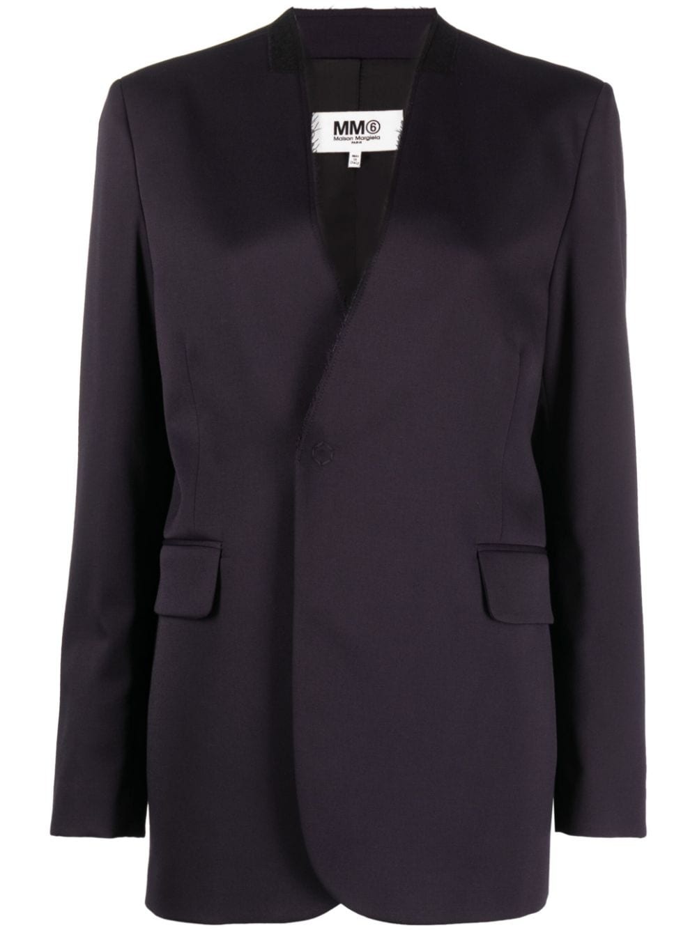 raw-edge single-breasted blazer A quintessentially love-worn take on the classic blazer, MM6 Maison Margiela’s single-breasted style is traced with a raw-edge trim. It’s tailored from a structured wool blend. Highlights - Navy blue - Virgin wool blend - Asymmetric design - V-neck - Raw edge - Front button fastening - Long sleeves - Two front flap pockets - Straight hem Composition Outer: Polyester 54%, Virgin Wool 44%, Spandex/Elastane 2% Lining: Viscose 100% SIZE & FIT Model measurements Height 5 ft 10 in(1.78 m) Bust/Chest 29.9 in(76 cm) Hips 34.6 in(88 cm) Waist 23.6 in(60 cm) FittingInformation Designed for a relaxed fit, this piece allows for comfort and movement when worn Made from a midweight non-stretch fabric This piece fits true to size – take your usual size