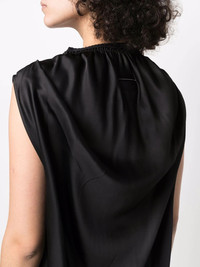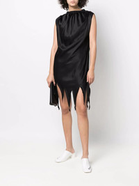 raw-hem satin dress black shift style signature single-stitch logo mock neck sleeveless raw-cut hem Made in Italy Composition Viscose 100%, Polyamide 80%, Spandex/Elastane 20% SIZE & FIT Model measurements Height 5 ft 10 in(1.79 m) Bust/Chest 31.88 in(81 cm) Hips 35.43 in(90 cm) Waist 23.62 in(60 cm) FittingInformation This piece fits true to size. We recommend you get your regular size Cut for a loose fit Made with a mid-weight non-stretch fabric Washing instructions Dry Clean Only
