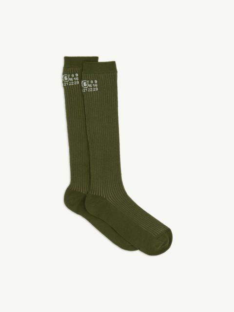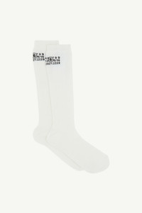 A minimalist knee-high sock worked in a fine rib for a streamlined profile. The design focuses on utility, with a stable cuff and reinforced foot area. Finished with the Maison’s numeric label at the upper leg. Product Details Item ID S62TL0049M13278101
