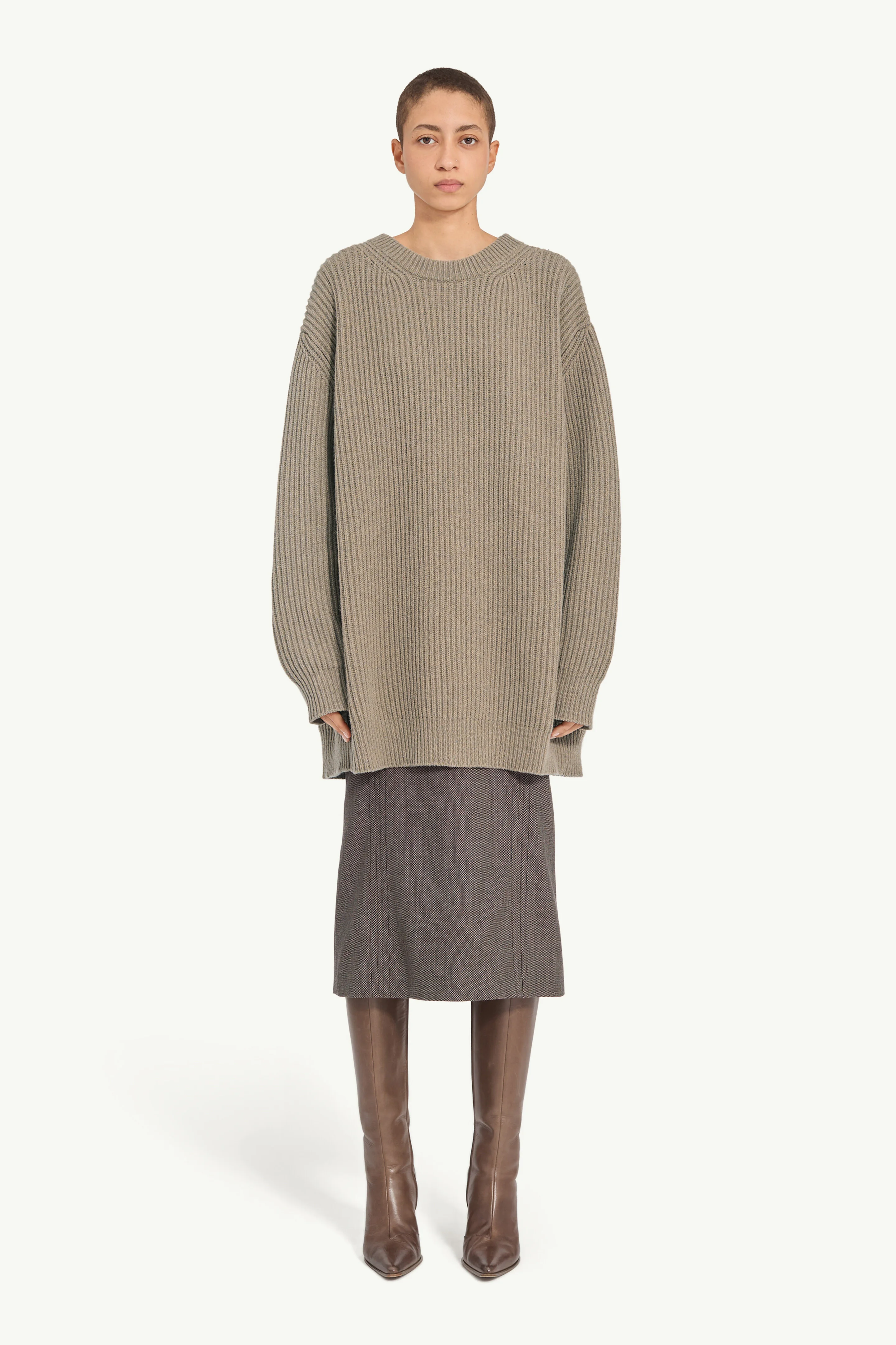 This oversized sweater dress showcases MM6’s Expansion technique with a back insert panel that unfolds to exaggerate the silhouette. With a relaxed fit, dropped shoulders and directional drape, it redefines knitwear through quiet irreverence. Finished with the white stitch line – MM6’s discreet signature. Product Details Item ID S62HL0042M13193114 Primary fabric: 80% Wool Secondary fabric: 20% Polyester Oversized sweater dress in ribbed wool blend Dropped shoulders and long sleeves Expansion panel White stitch line at the back Made in Italy Model is 180 cm tall and wears a size M.