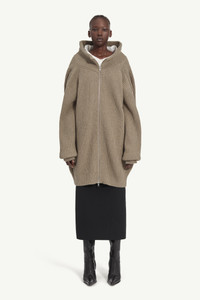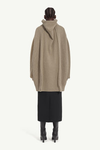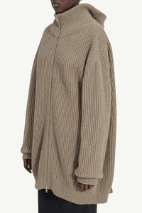 This ribbed wool cardigan is cut to an oversized shape, with a vertical panel at the back that can be worn closed or expanded for extra volume. The structured knit holds its form, anchored by a stand collar and two-way zip. Ready when worn, finished with the MM6 white stitch line at the back. Product Details Item ID S62AN0158M13193114 Primary fabric: 80% Wool Secondary fabric: 20% Polyester Ribbed knit cardigan with folded-back panel Oversized silhouette with stand collar Two-way zip fastening Dropped shoulders Straight hem White stitch line at the back Made in Italy Model is 179 cm tall and wears a size M.
