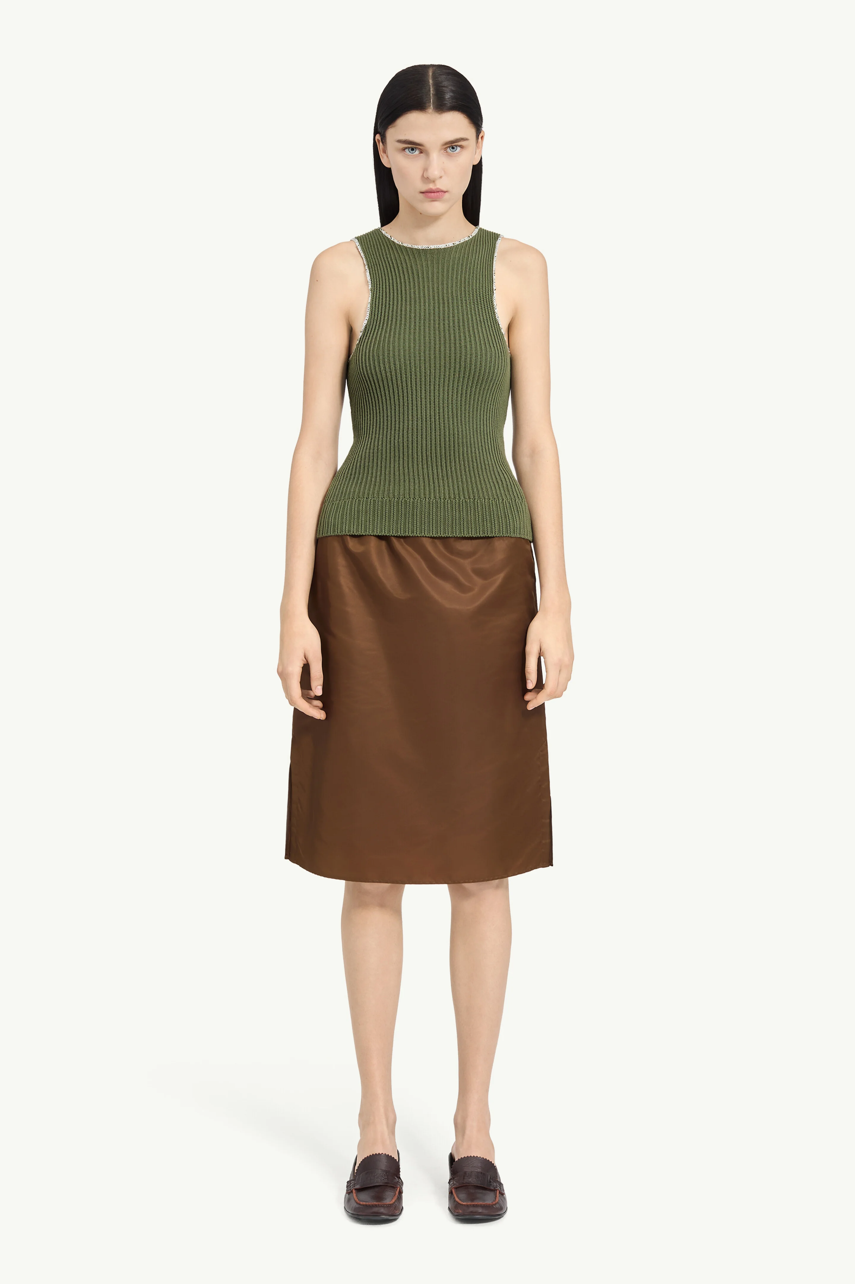 A sleeveless knit top worked in a vertical rib structure that offers a close, linear fit. The cut is clean and minimal, with a simple neckline and arm openings finished with contrast edging. At the back, a stitched numeric label adds a subtle point of identification. Product Details Item ID S62NC0180M13271693